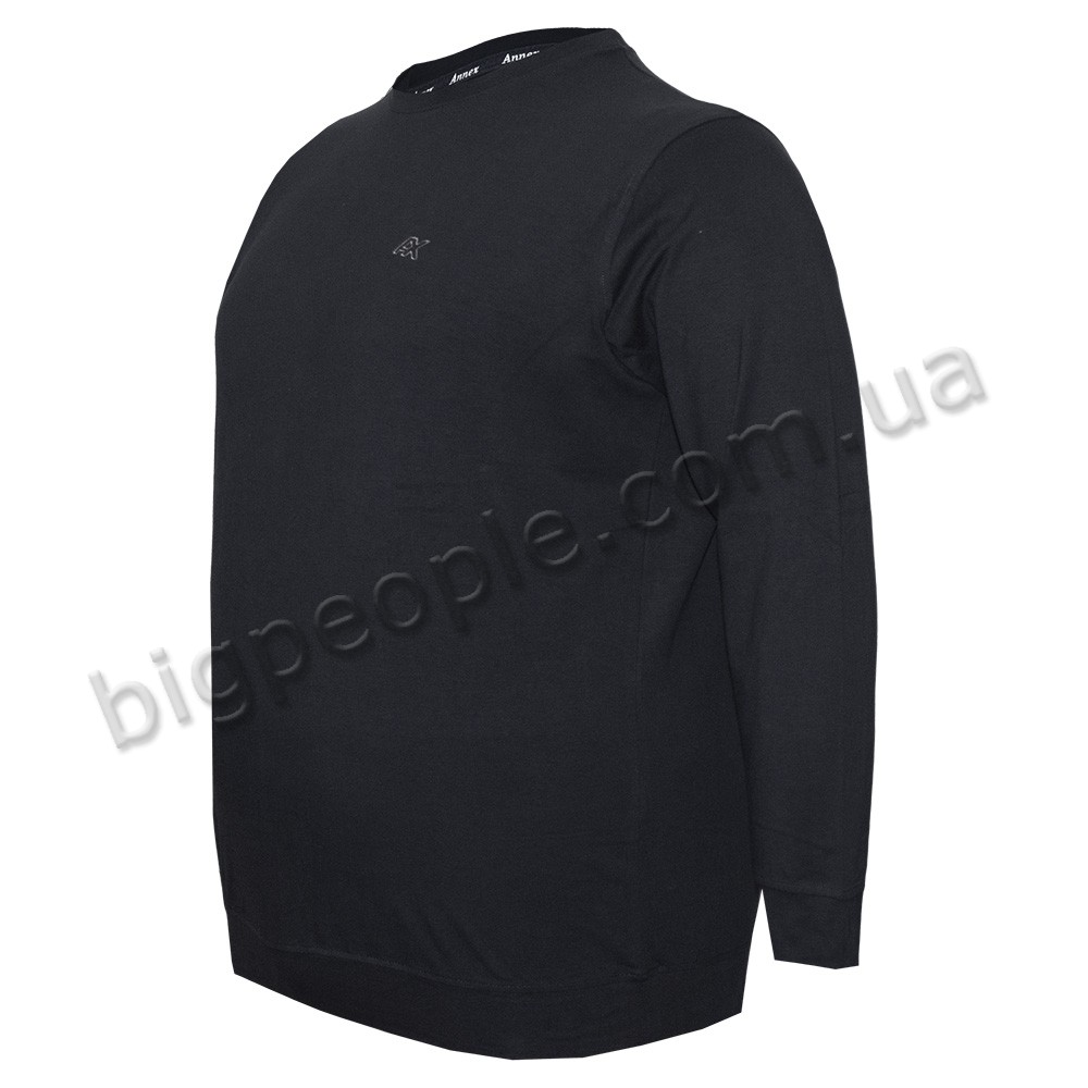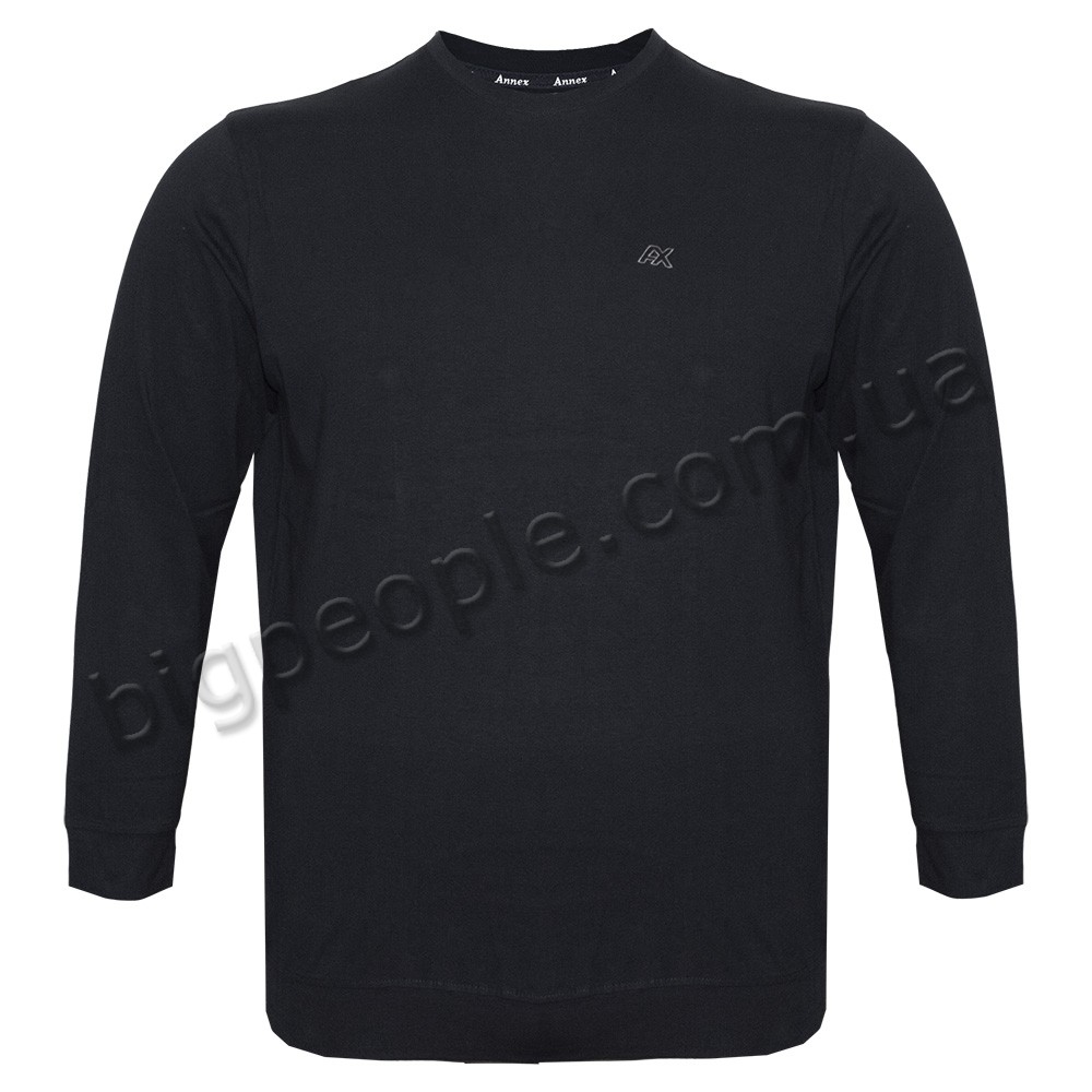 Черная мужская футболка большого размера с длинным рукавом (лонгслив) ANNEX. Тонкая легкая ткань. Воротник полукруглый. Низ на манжете (на резинке). Рукава на манжете. Карманы отсутствуют. Впереди находится эмблема. Производство Турции. Состав cotton (хлопок) 95%, эластан 5%.