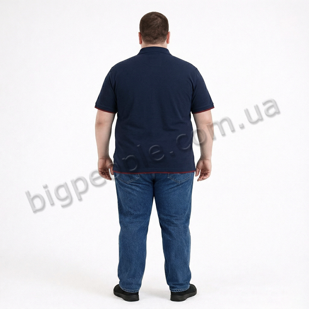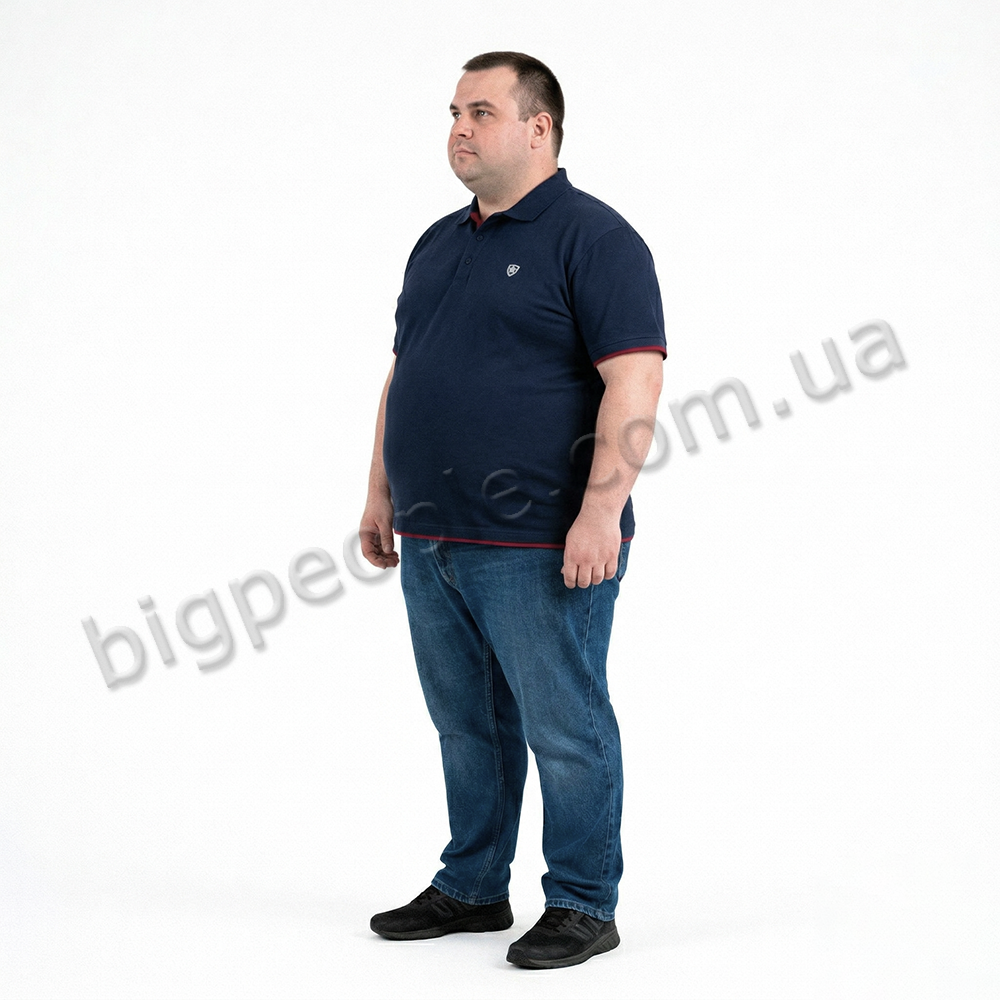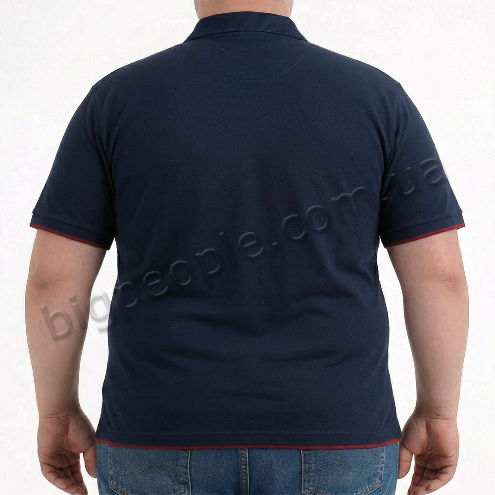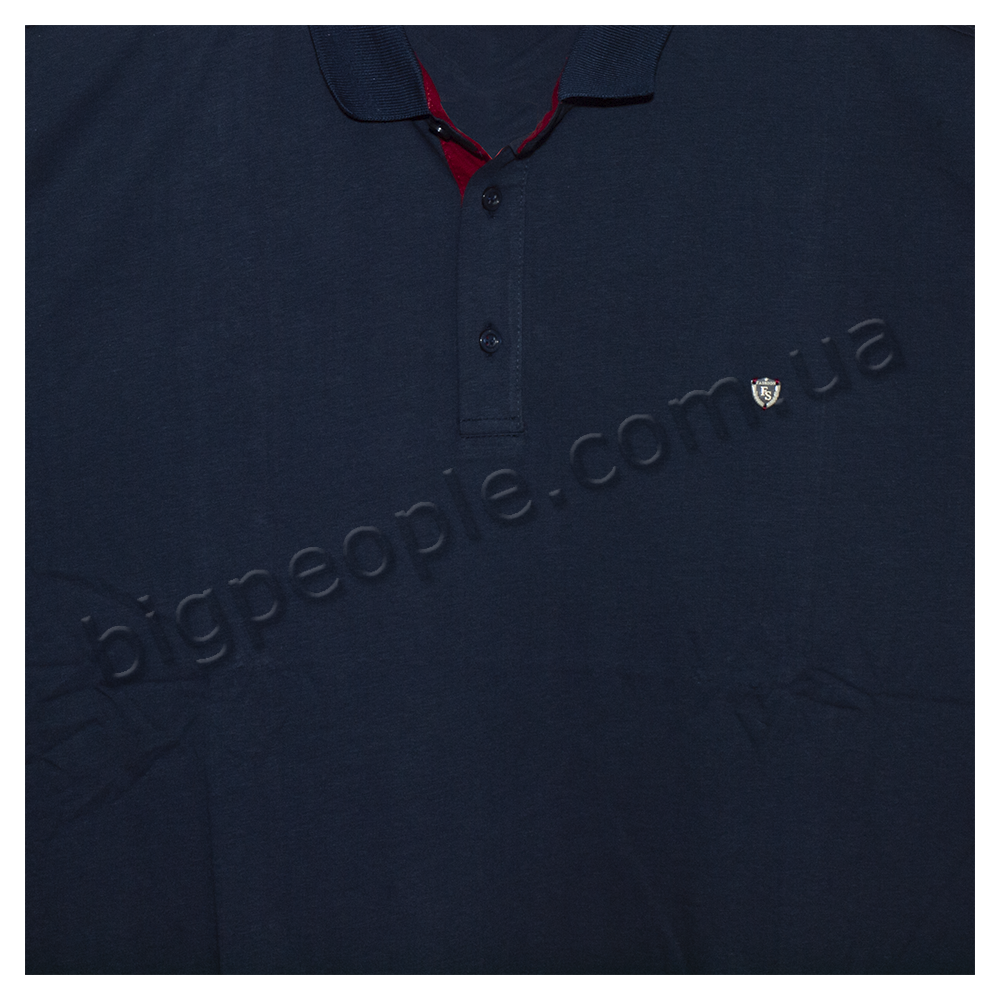 Темно-синее мужское поло большого размера TURHAN. Модель с воротником поло с тремя пуговицами. Карманов нет. Внизу прямая модель. На рукавах и внизу окантовка из ткани бордового цвета. Производство Турции. Состав cotton (хлопок) 100%.