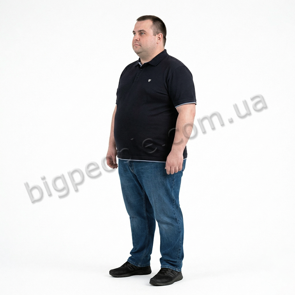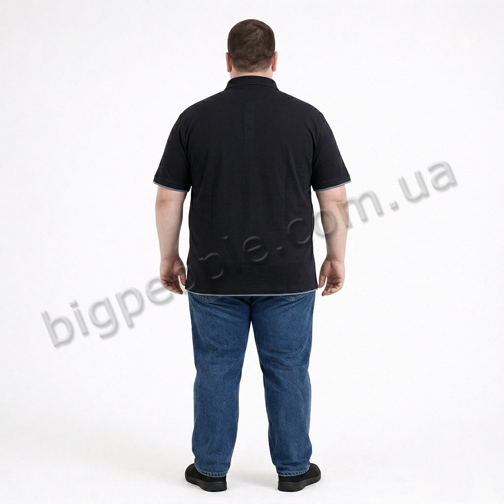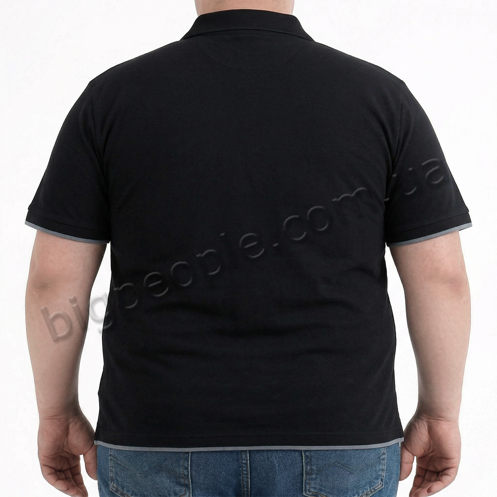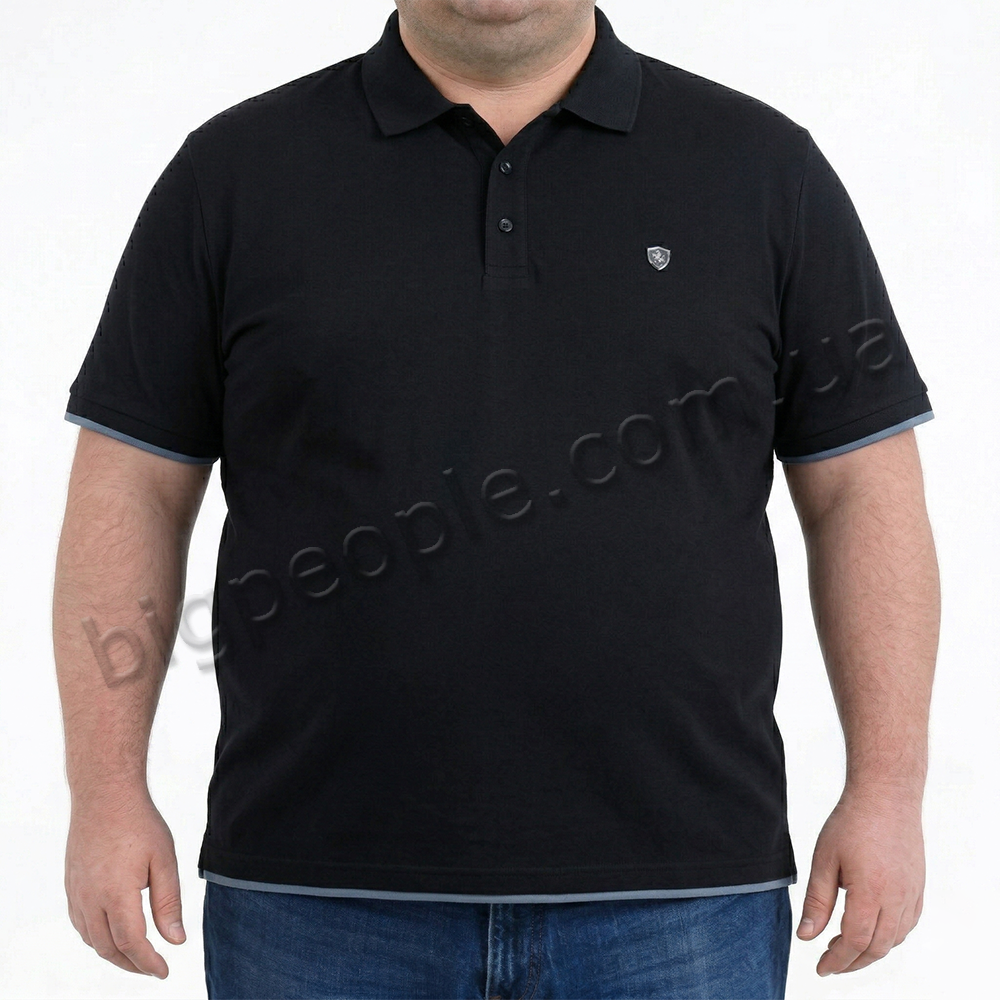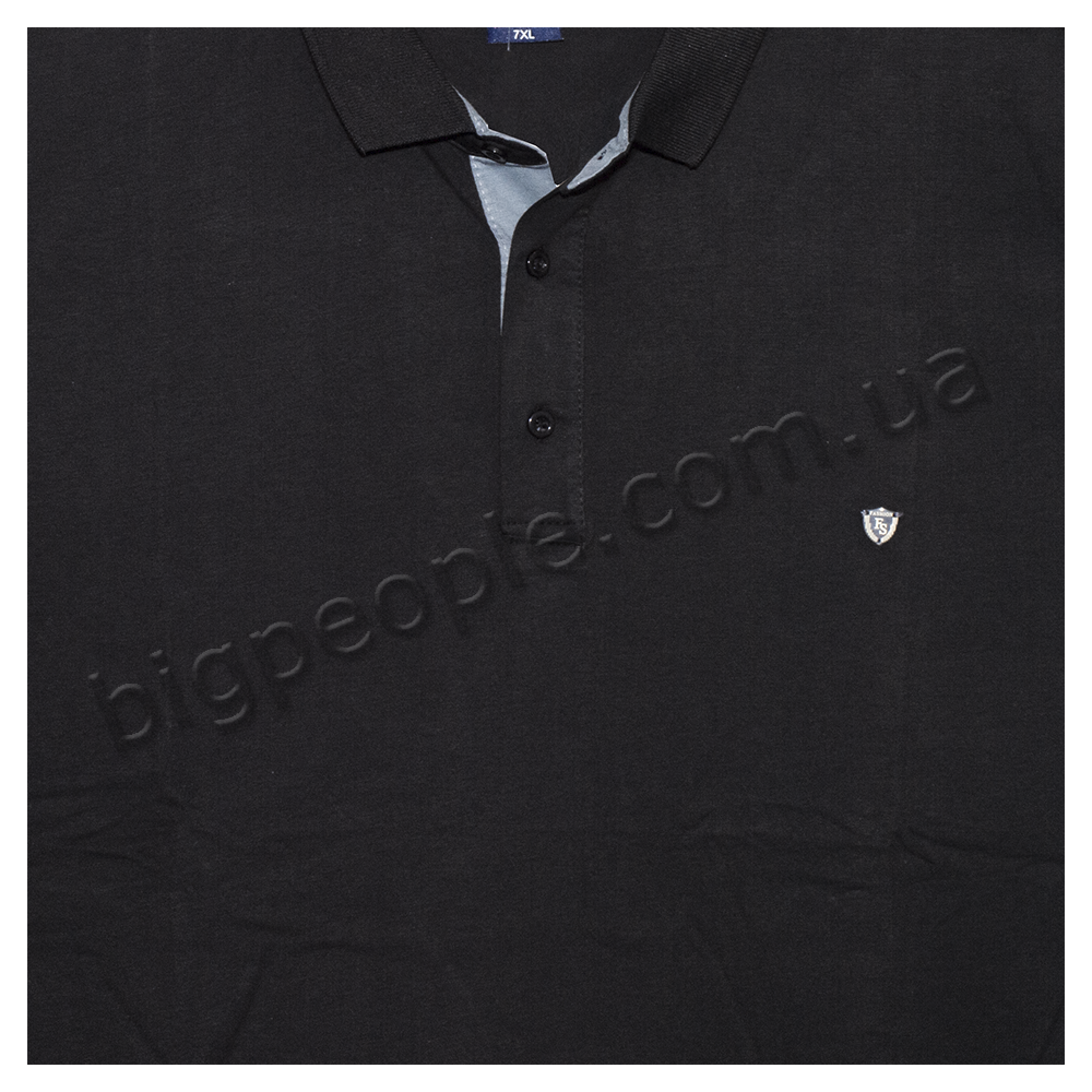 Чёрное мужское поло большого размера TURHAN. Модель с воротником поло с тремя пуговицами. Карманов нет. Внизу прямая модель. На рукавах и внизу окантовка из ткани чёрного цвета. Производство Турции. Состав cotton (хлопок) 100%.