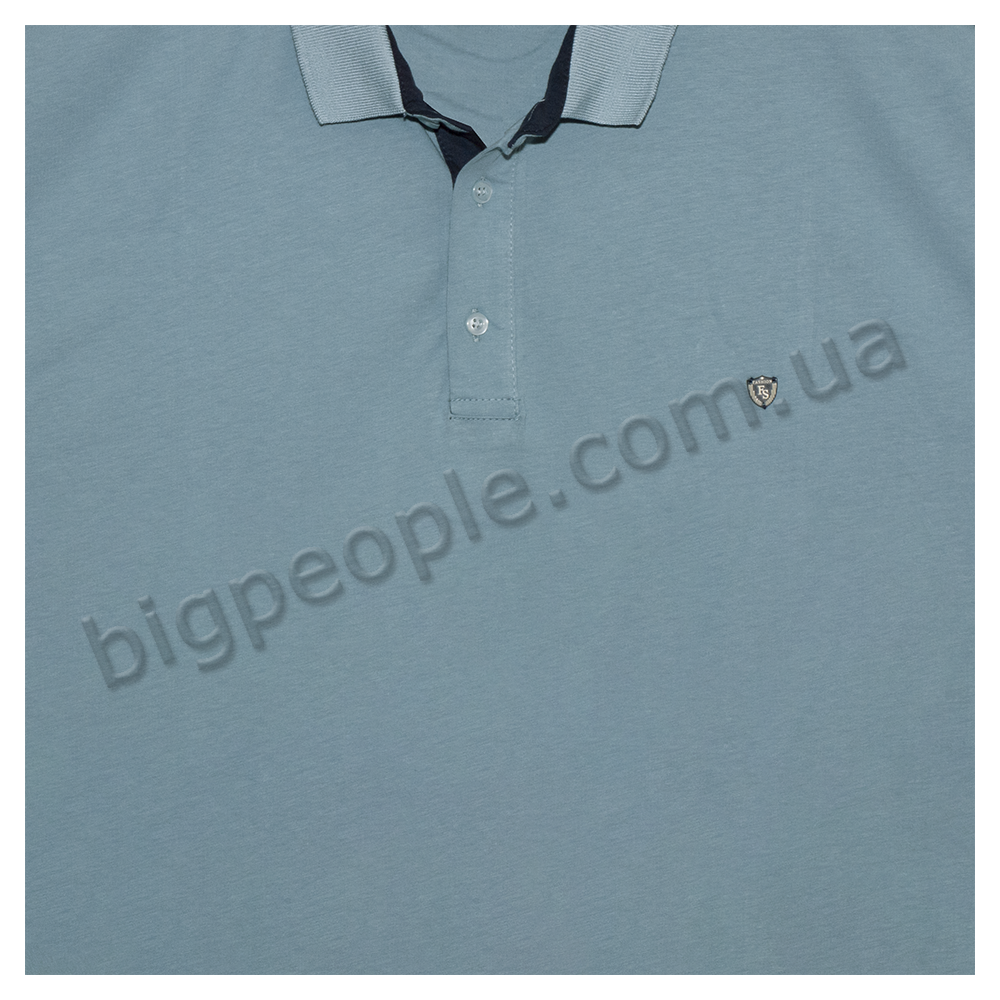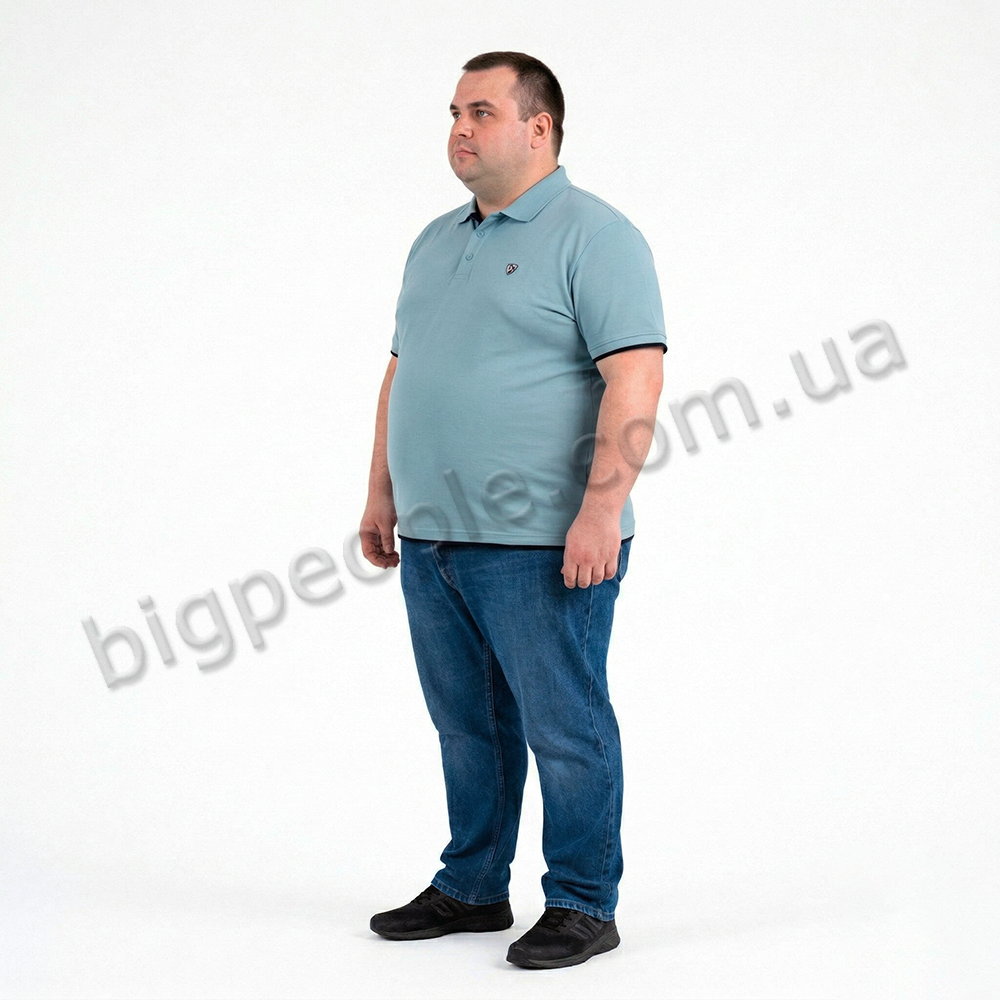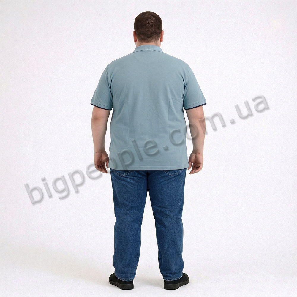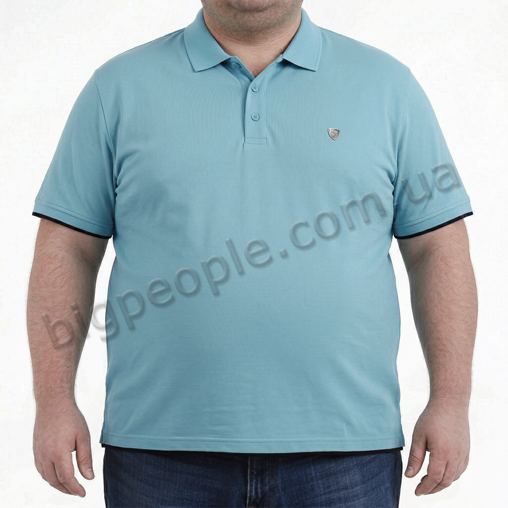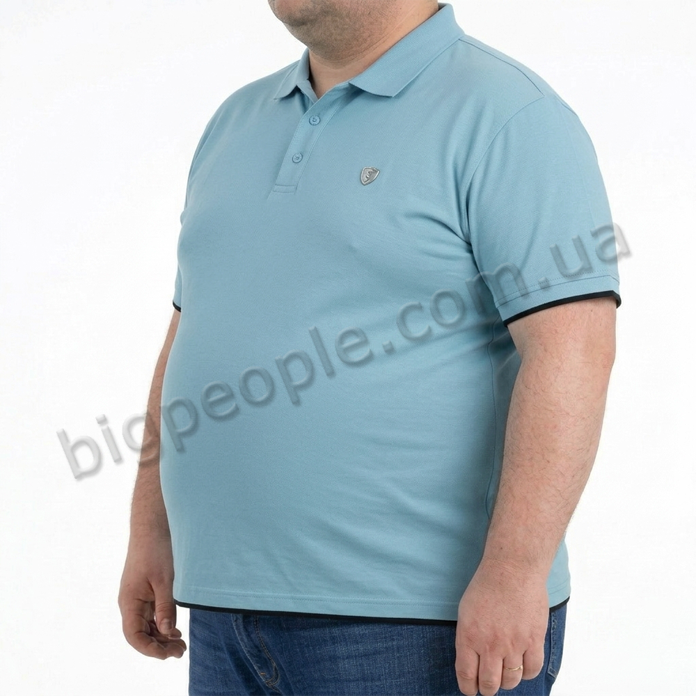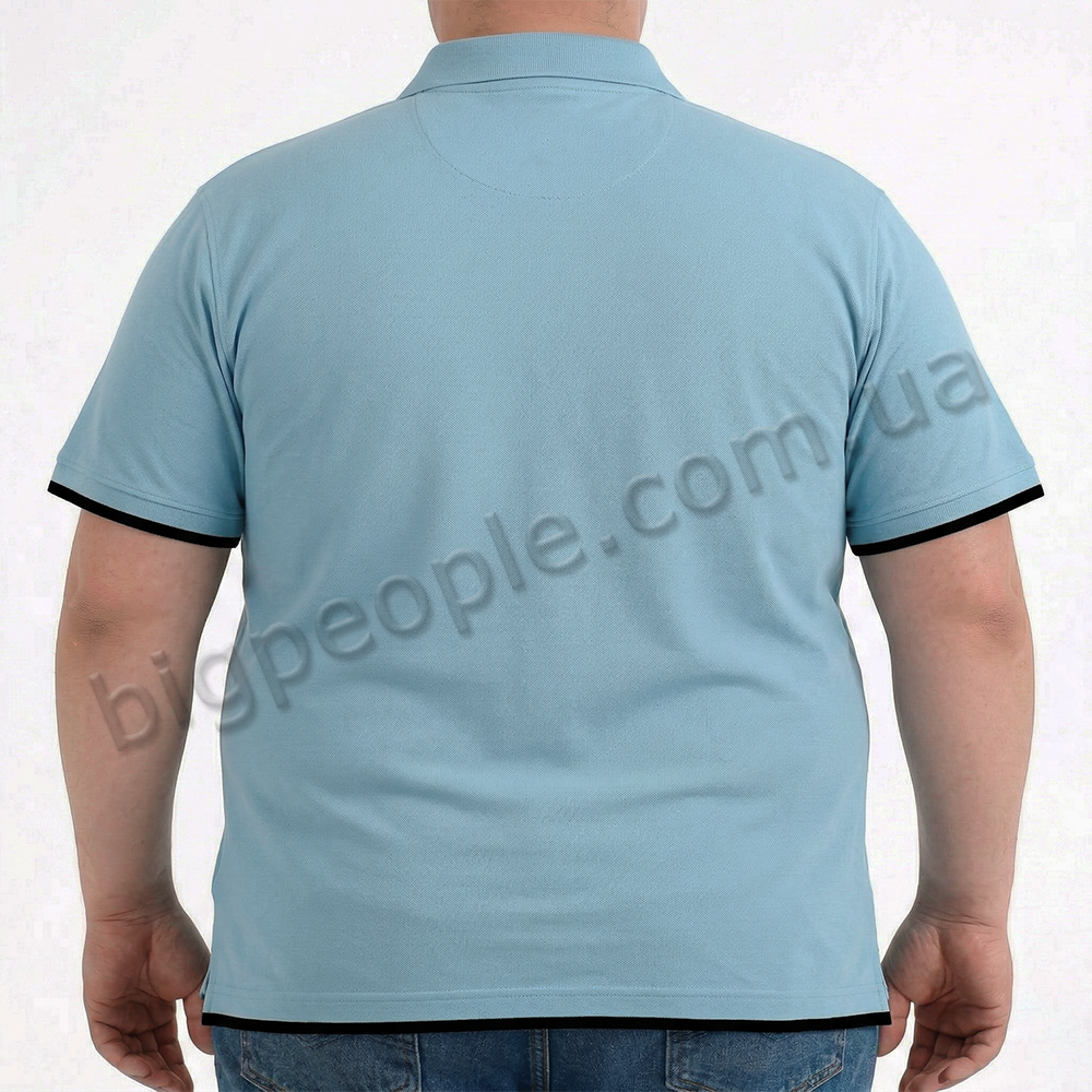 Голубое мужское поло большого размера TURHAN. Модель с воротником поло с тремя пуговицами. Карманов нет. Внизу прямая модель. На рукавах и внизу окантовка из ткани чёрного цвета. Производство Турции. Состав cotton (хлопок) 100%.