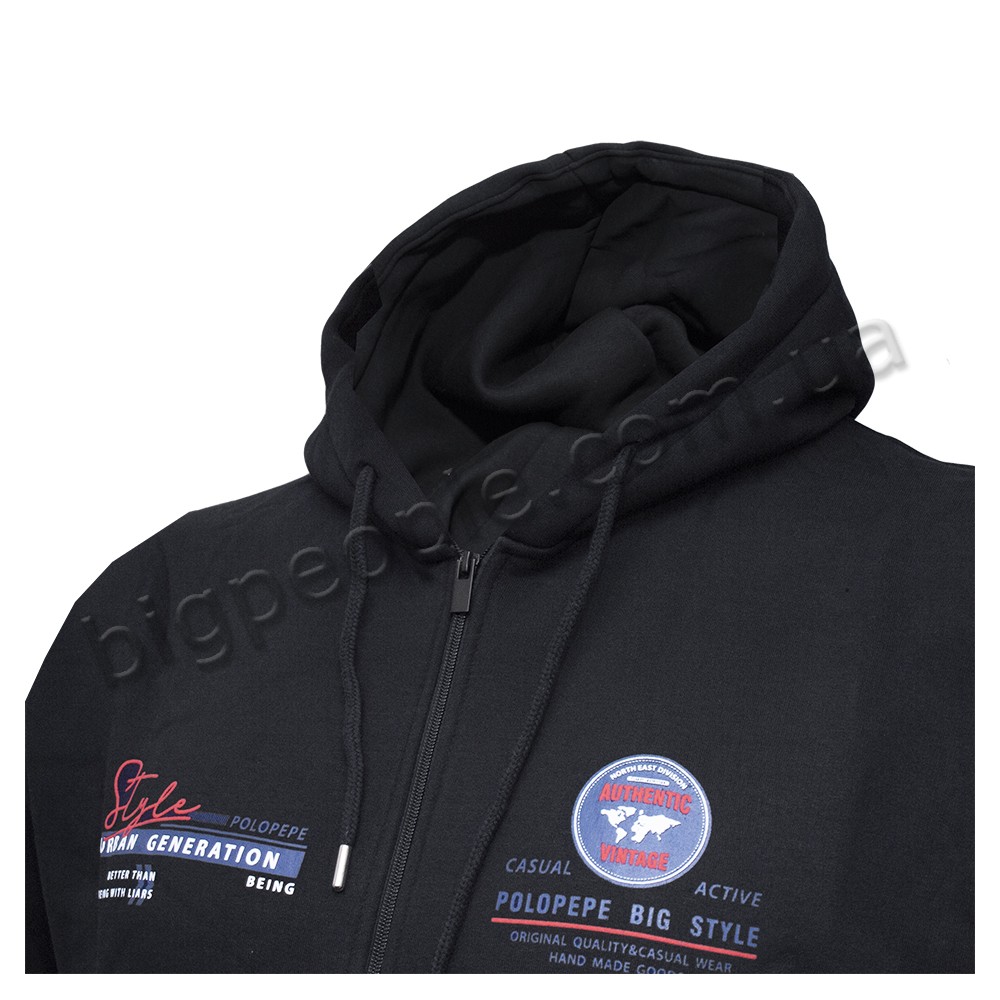 Мужская тёмно-синяя толстовка большого размера POLO PEPE (утепленная). Застегивается на молнию. Манжет внизу и на рукавах. На груди присутствует принт. Имеется капюшон. Капюшон не отстёгивается. Состав cotton 100%. Трикотажная утепленная толстовка, ткань с начесом с изнаночной стороны. Цвет чёрный.