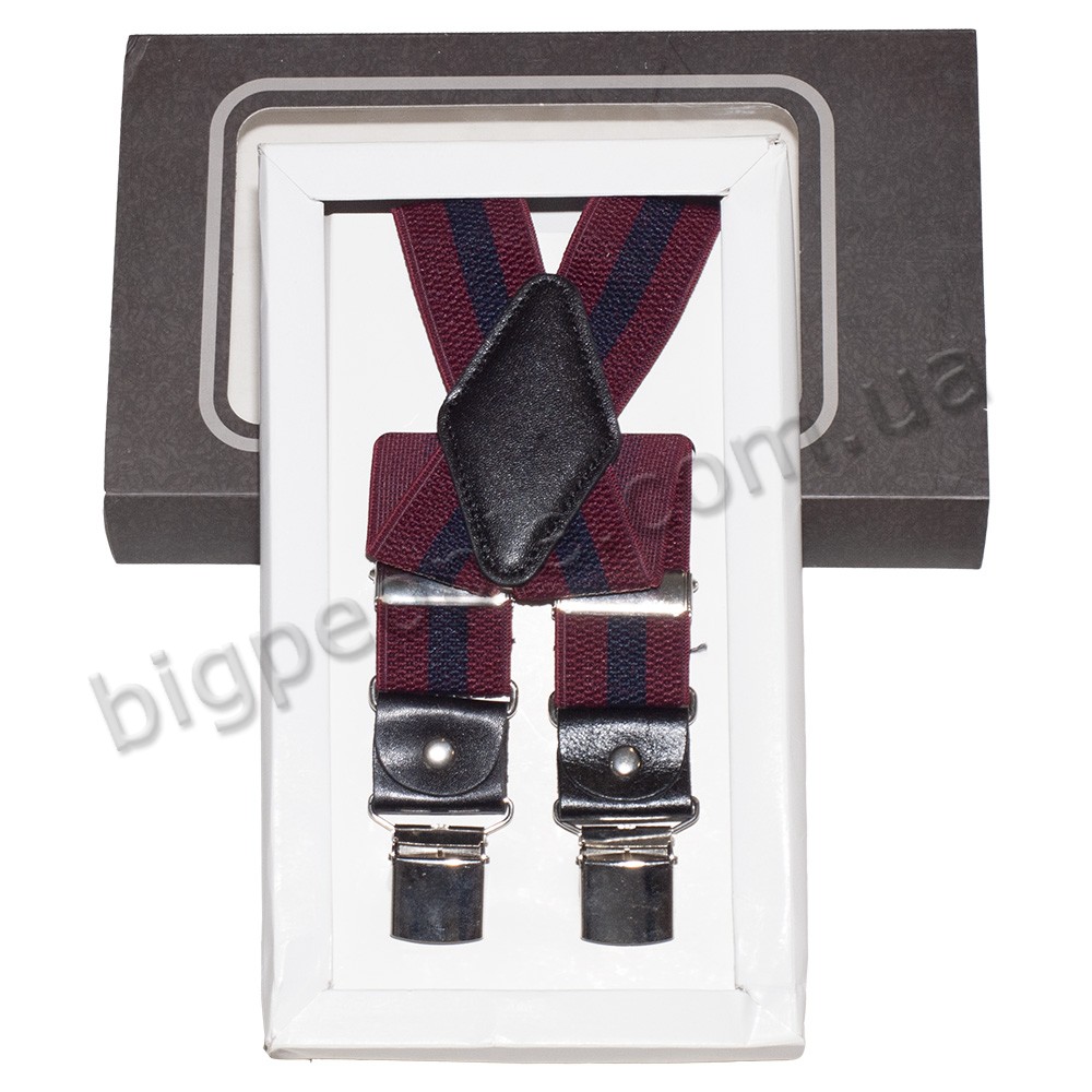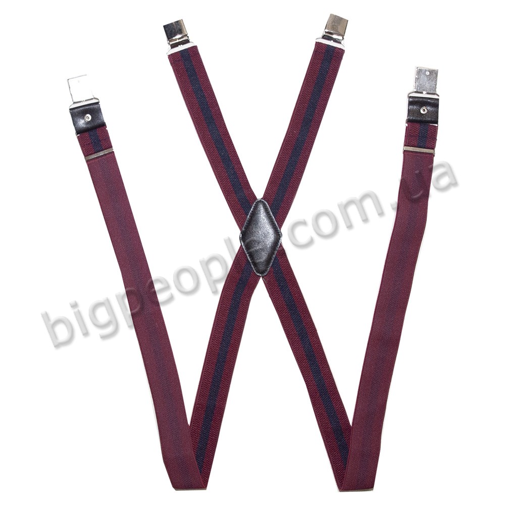 Бордові чоловічі підтяжки великого розміру OLSER. Класична X-подібна форма на чотири защипи. Защипи металеві. Ширина виробу 35 мм, максимальна довжина нерастягнутої резинки 105 см, довжина разом з защипами - 110 см. Довжину можна відрегулювати під свої потреби. Кольор бордовий. Виробництво Туреччина. Склад - бавовна 80%, поліестер 10%, еластан 10%.