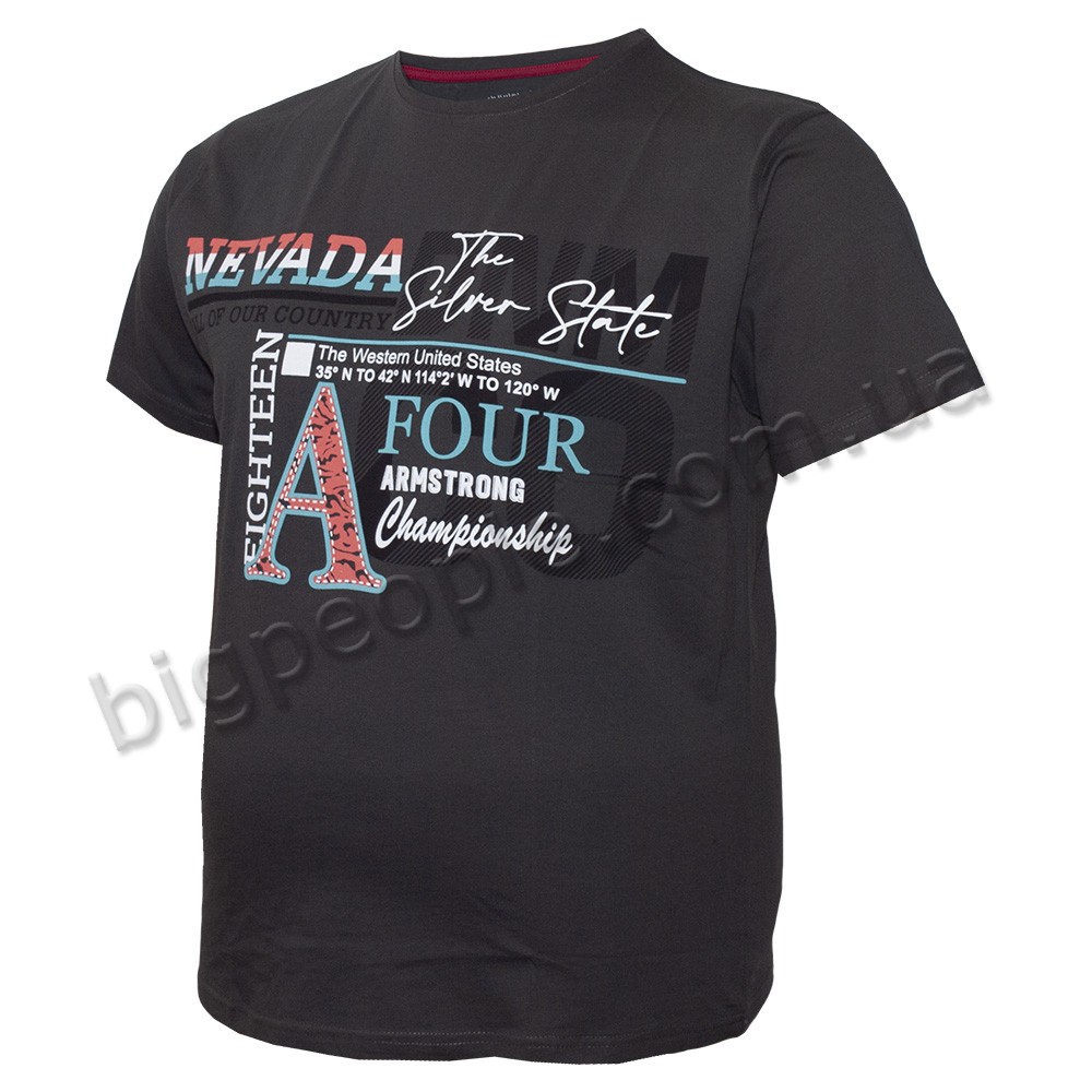 Футболка ARMSTRONG для великих чоловіків. Колір темно-сірий. Низ футболки прямий, без манжети. На футболці присутній оригінальний принт. Виробництво Туреччина. Склад cotton (бавовна) 100%.