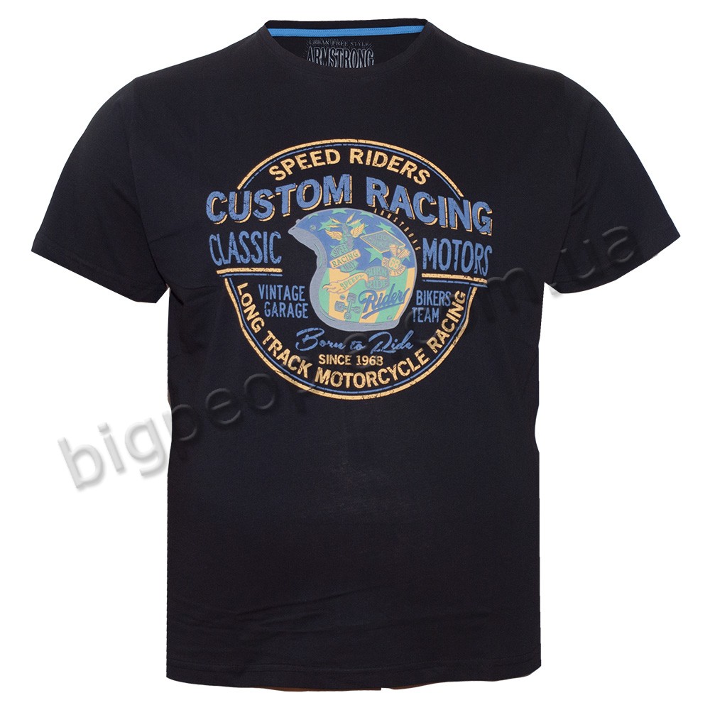 Футболка ARMSTRONG для великих чоловіків. Колір чорний. Низ футболки прямий, без манжети. На футболці присутній оригінальний принт. Виробництво Туреччина. Склад cotton (бавовна) 100%.