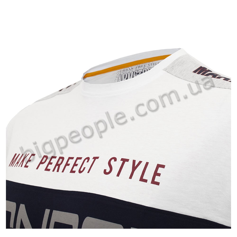 Чоловіча пряма футболка ARMSTRONG, великого розміру. Модель темно-синього кольору, з вставками різних кольорів. Низ виробу прямий, без манжети. На моделі є оригінальний принт у вигляді надписів. Виробництво Туреччина. Склад cotton (бавовна) 100%.