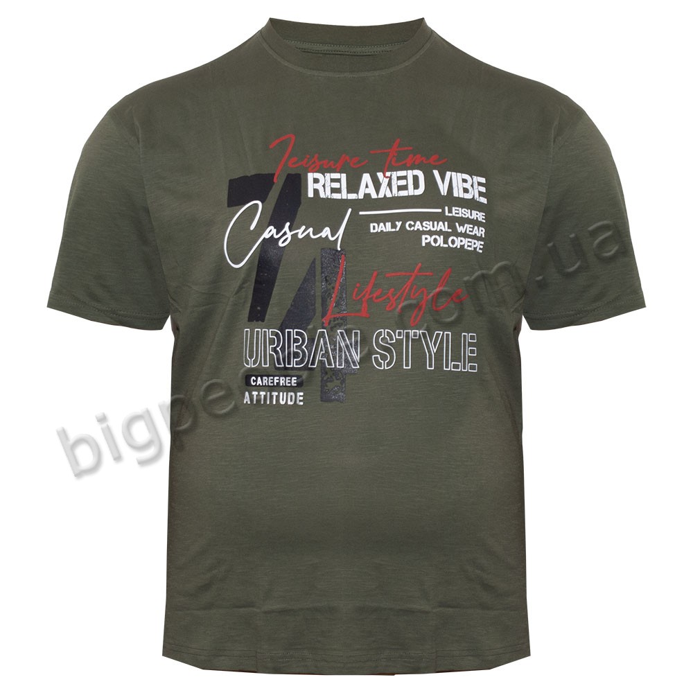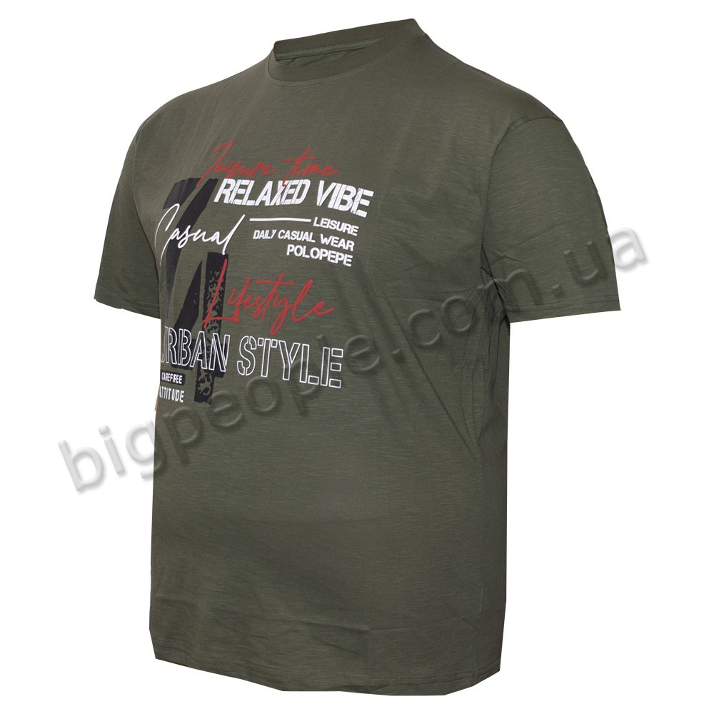 Чоловіча футболка великого розміру від виробника POLO PEPE. Колір хакі. На виробі присутній оригінальний принт. Виробництволено в Туреччині. Склад cotton (бавовна) 100%.