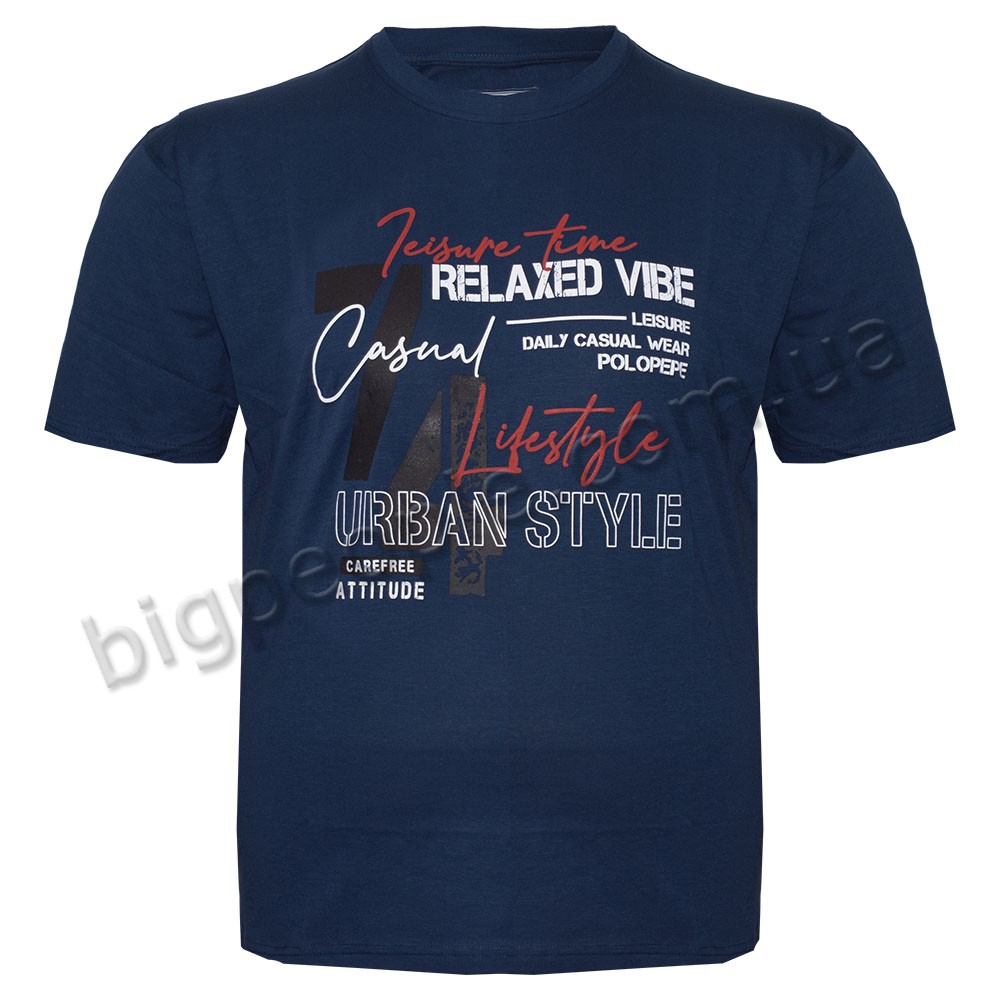 Чоловіча футболка великого розміру від виробника POLO PEPE. Колір синій (індіго). На виробі присутній оригінальний принт. Виробництволено в Туреччині. Склад cotton (бавовна) 100%.
