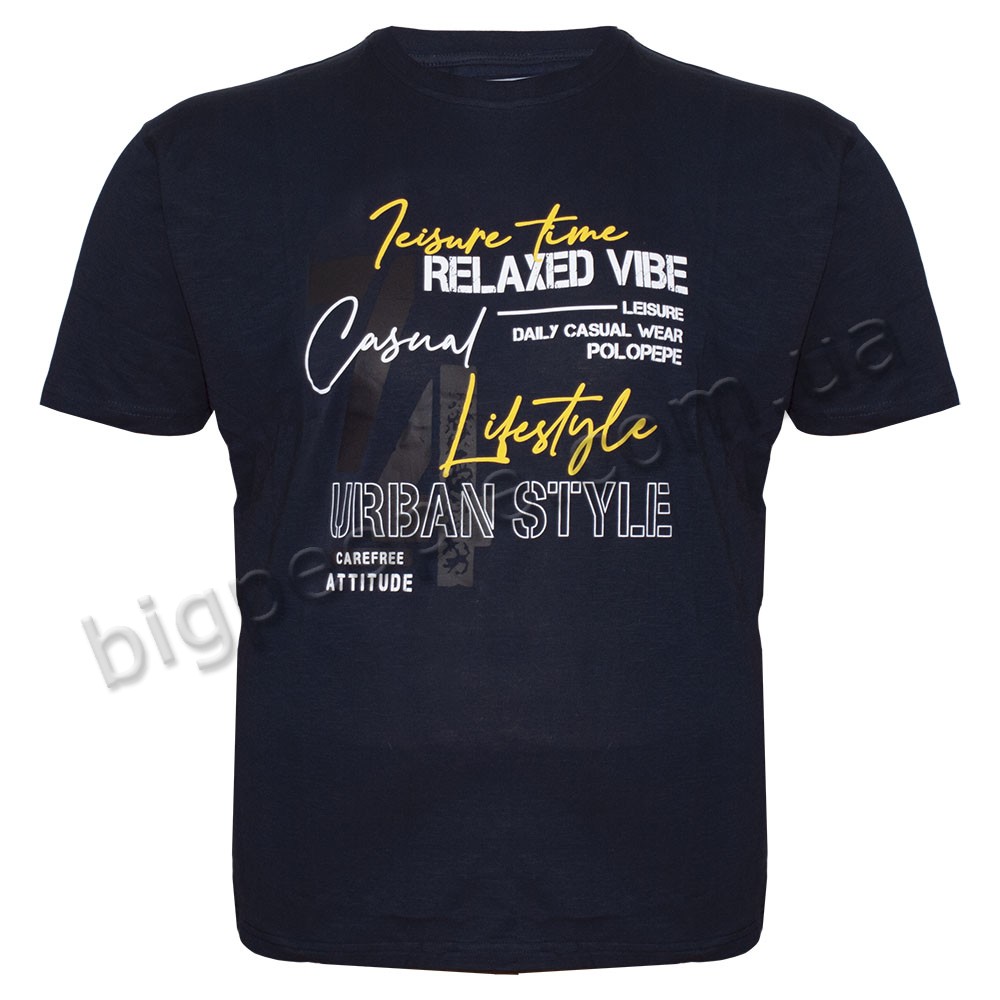 Чоловіча футболка великого розміру від виробника POLO PEPE. Колір темно-синій. На виробі присутній оригінальний принт. Виробництволено в Туреччині. Склад cotton (бавовна) 100%.