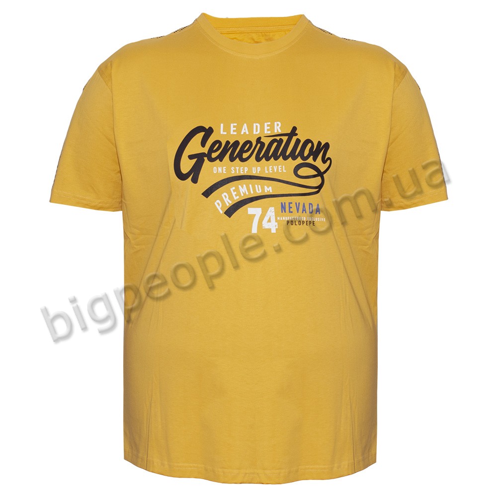 Стильна чоловіча футболка POLO PEPE великого розміру. Колір тканини жовтий. Попереду і на плечах є малюнок. Виробництво Туреччина. Склад cotton (бавовна) 100%.