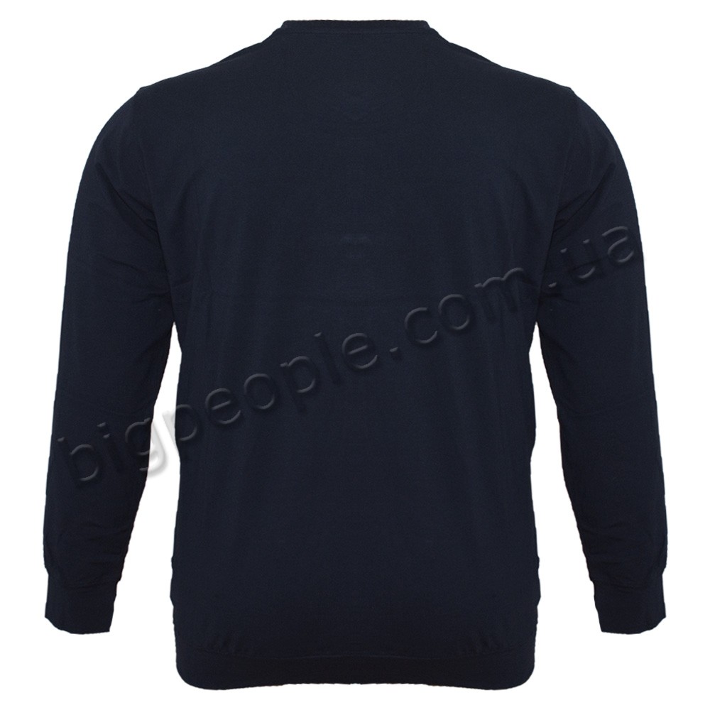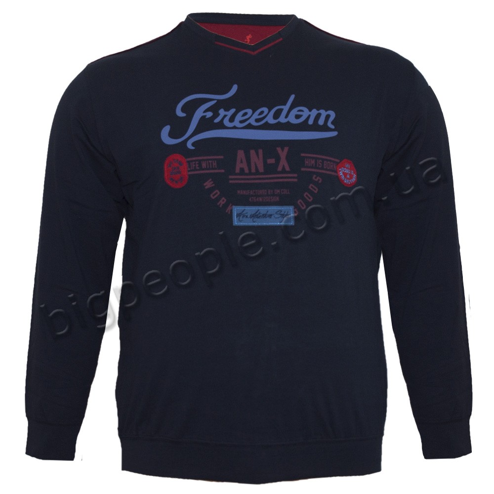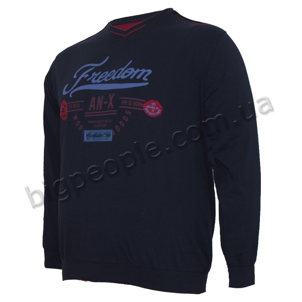 Темно-синя чоловіча футболка великого розміру з довгим рукавом ANNEX. Тонка легка модель. Комір мисиком (V-подібний). Вниз на манжеті (резинці). Рукава на манжеті. Кишені відсутні. Попереду малюнок. Виробництво Туреччини. Склад cotton (бавовна) 100%.
