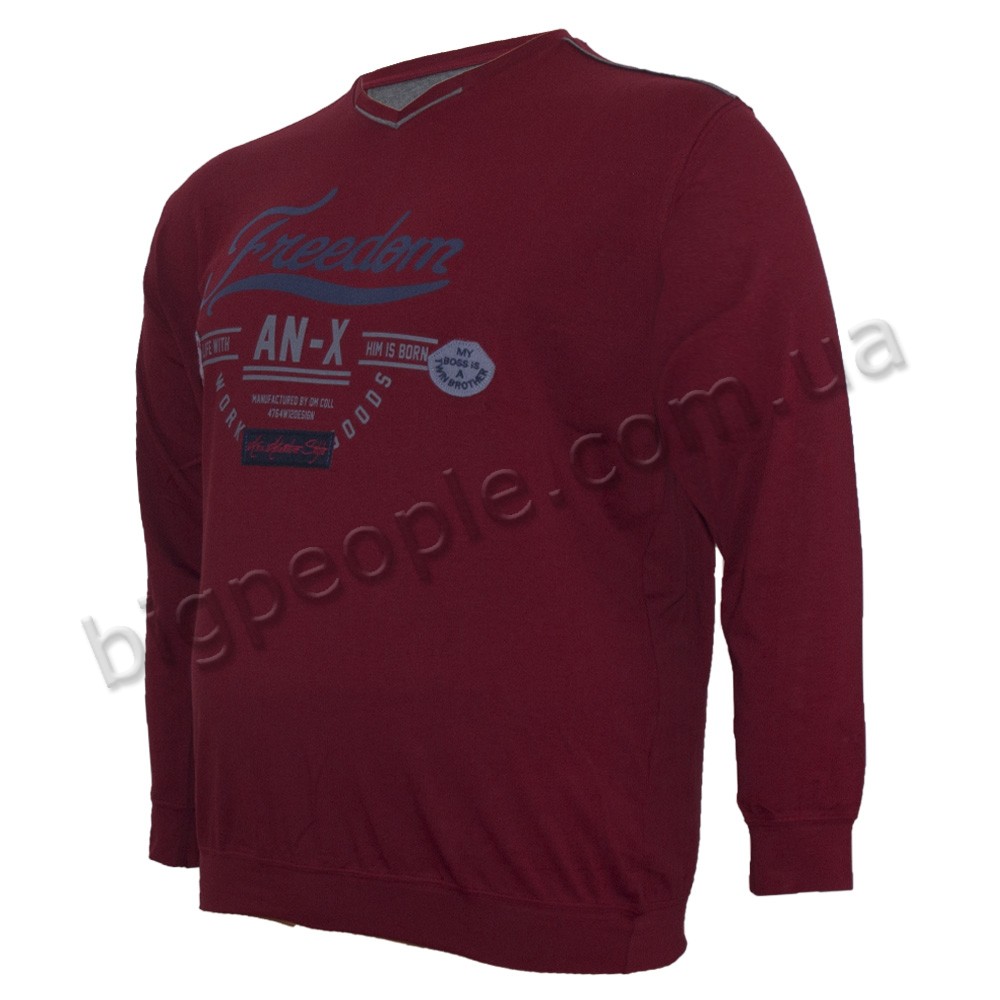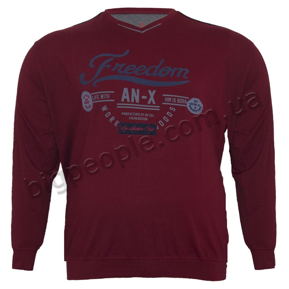 Бордова чоловіча футболка великого розміру з довгим рукавом ANNEX. Тонка легка модель. Комір мисиком (V-подібний). Низ на манжеті (резинці). Рукава на манжеті. Кишені відсутні. Попереду малюнок. Виробництво Туреччини. Склад cotton (бавовна) 100%.