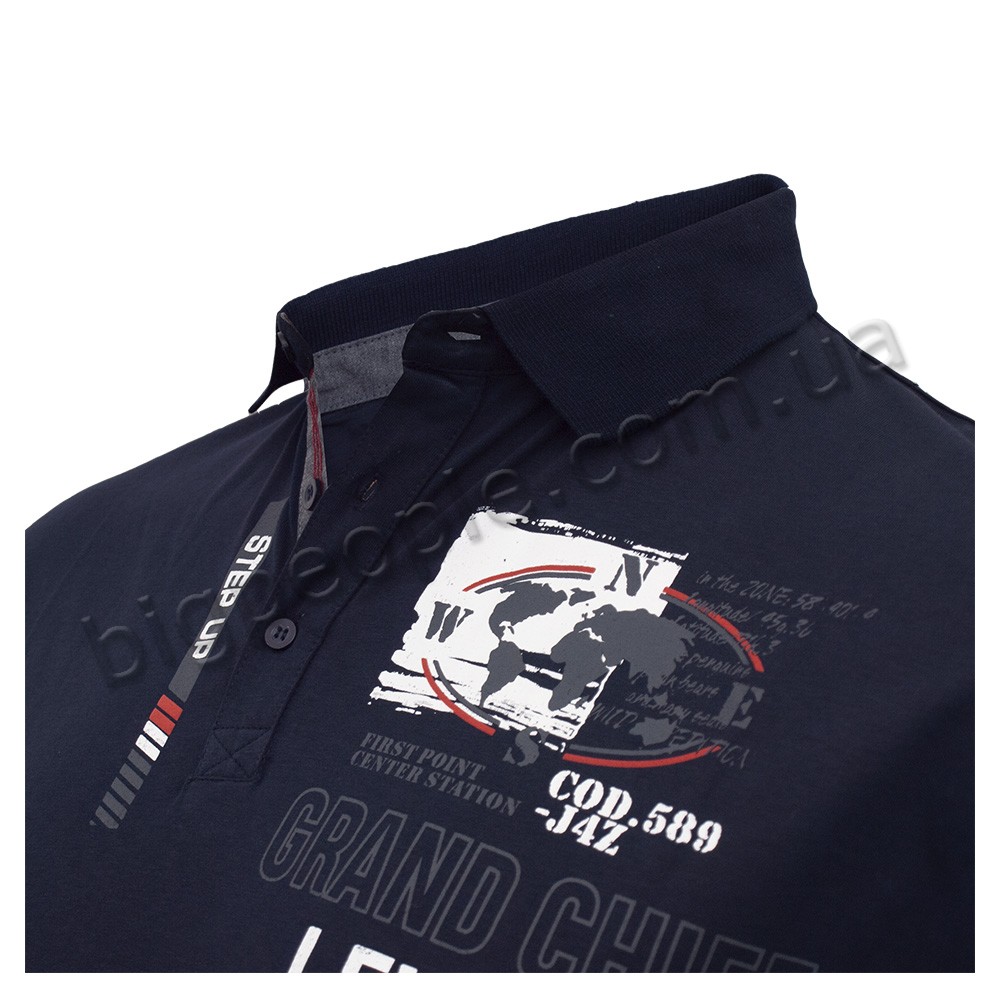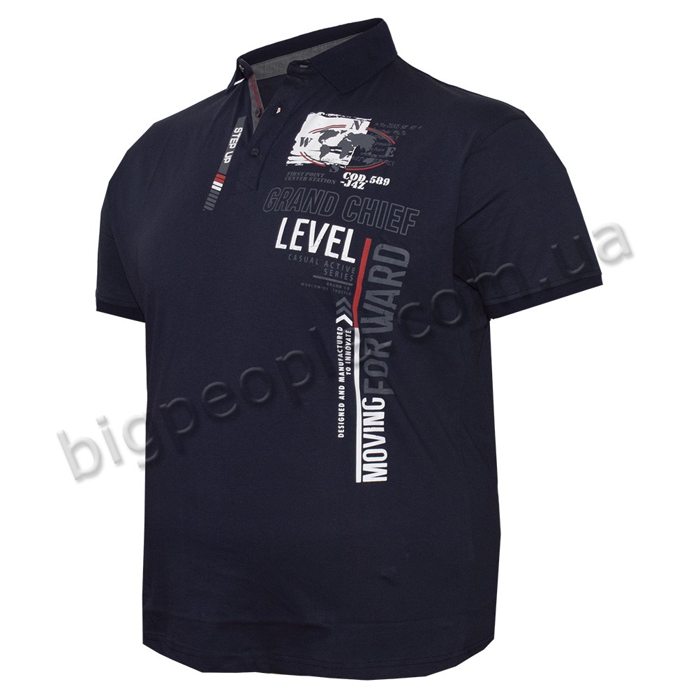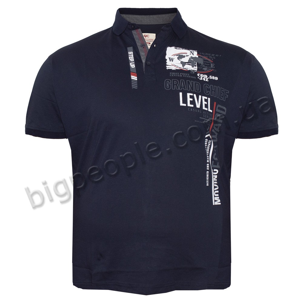 Темно-синя футболка-поло GRAND CHIEF великого роміру чоловіча. На грудях принт і нашивка. На рукавах манжет, низ прямий. Виробництво Туреччина. Склад cotton (бавовна) 70%, лікра 30%.