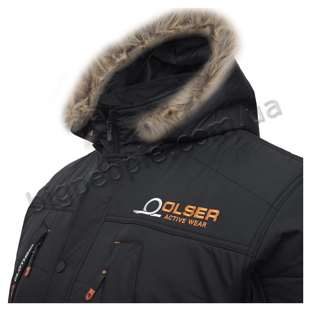 Тепла зимова чоловіча куртка – аляска, великого розміру OLSER. Виріб прямий знизу, з затяжками по боках знизу. Є чотири кишені на блискавці попереду, чотири внутрішні кишені. На рукавах є стяжки. Тканина – щільна, легка плащівка. Капюшон і хутро можна відстебнути окремо. Виробництво Туреччина. Склад – поліестр, синтепон. Зимовий сезон. Колір чорний.