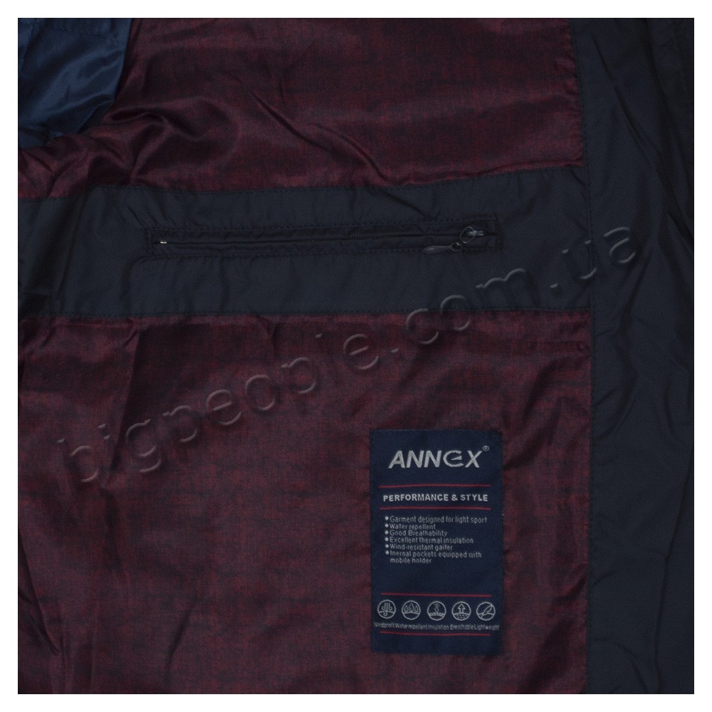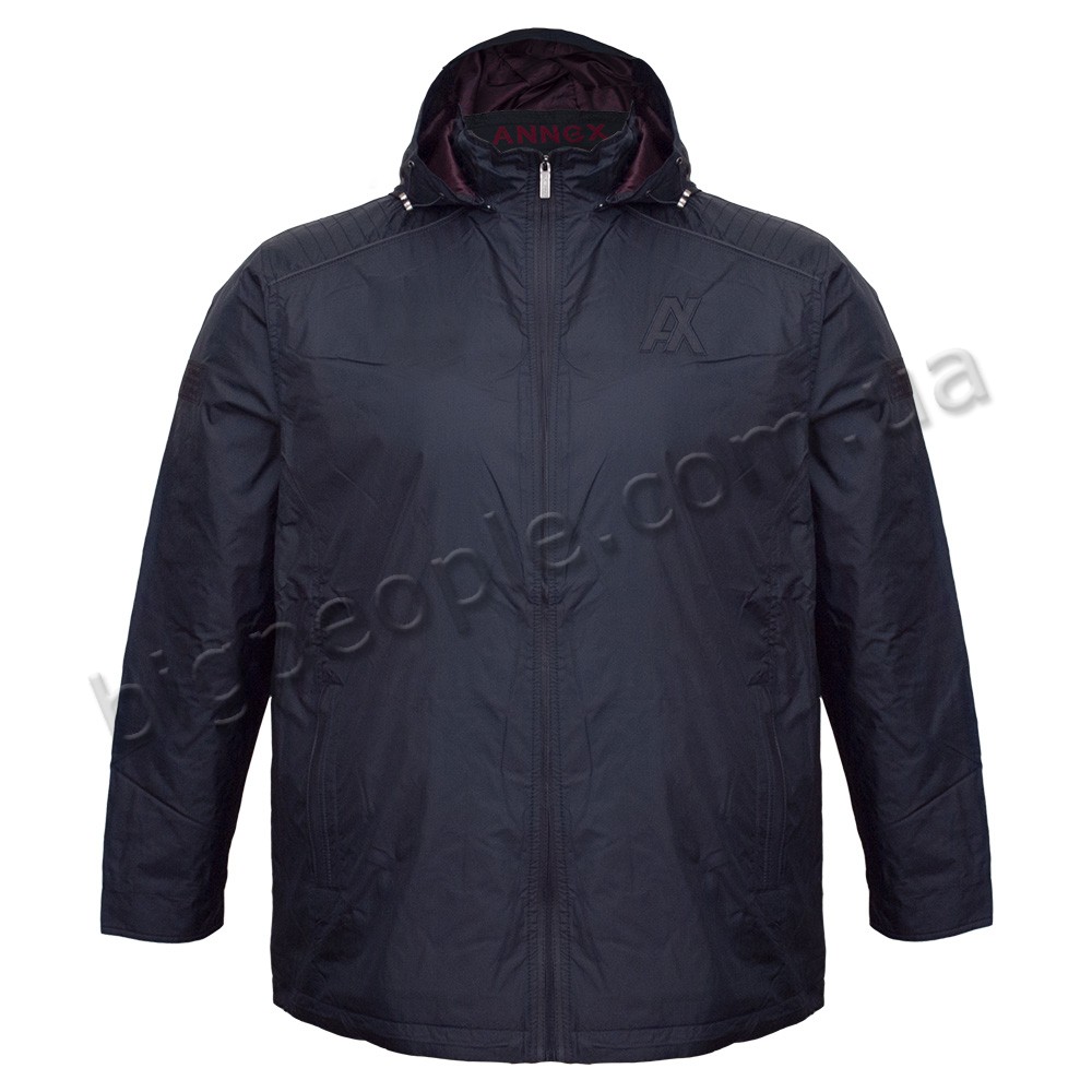 Куртка чоловіча ANNEX великих розмірів. Попереду знаходиться 2 кишені на блискавці, одна кишеня на блискавці всередині. Капюшон відстібається за необхідності. Склад плащівка (поліестер) 100%. Колір темно-синій. Виробництво Туреччина.