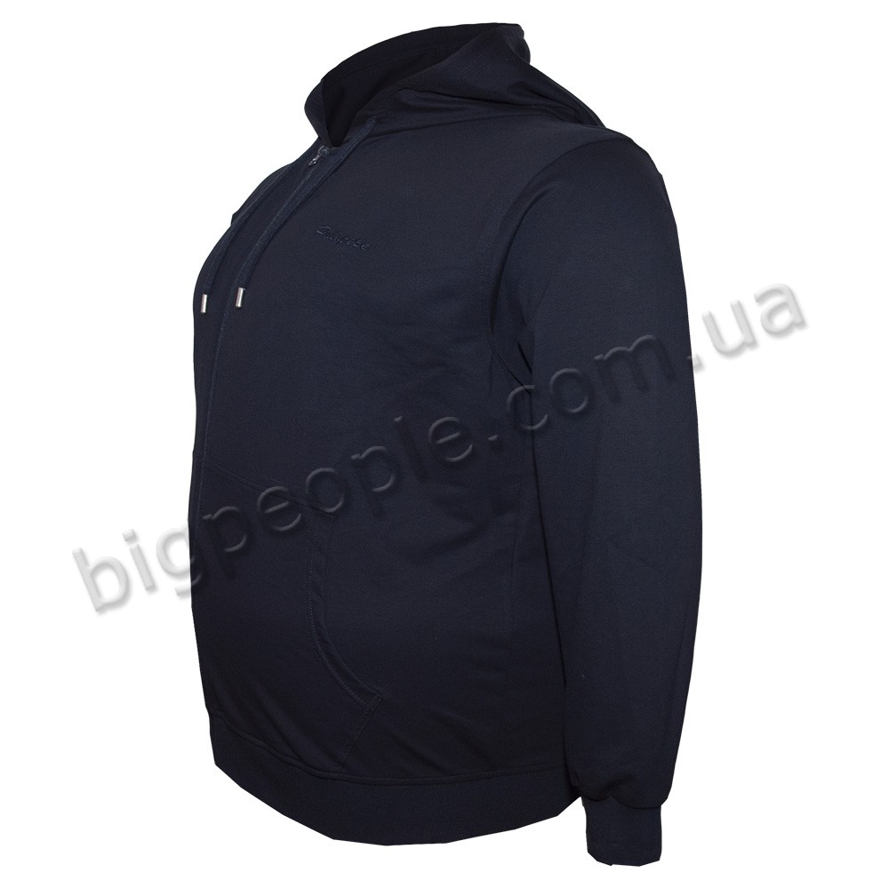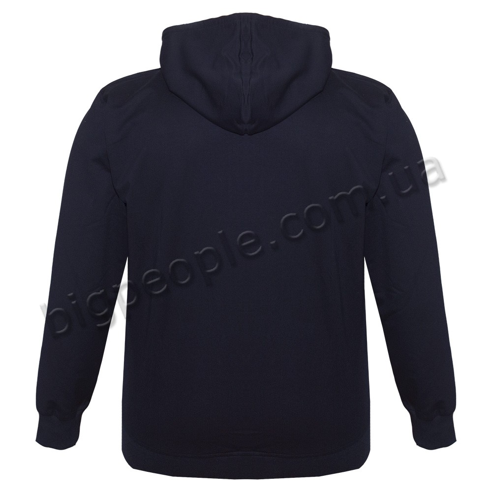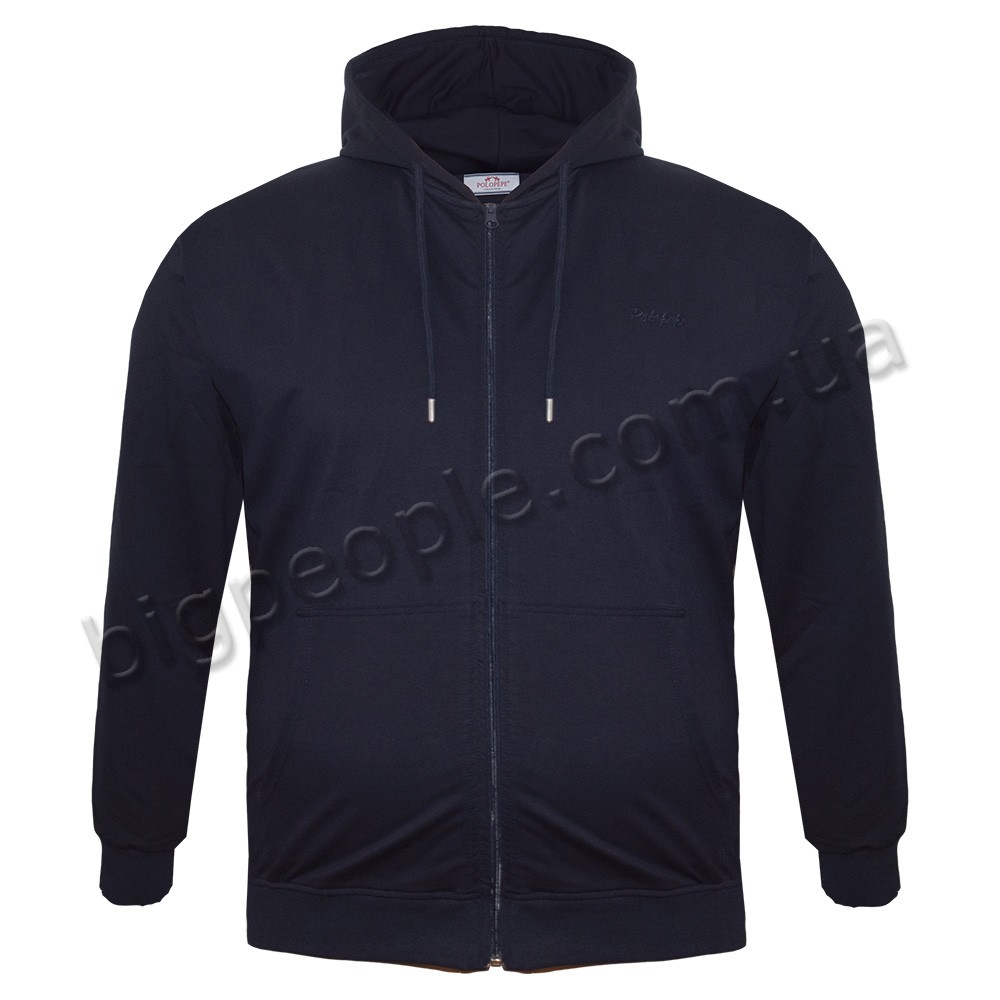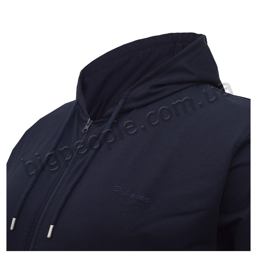 Чоловіча кофта великого розміру POLO PEPE. Застібається на блискавку. Внизу та на рукавах є гумка (манжети). Є капюшон. Склад cotton 85%, поліестер 10%, лікра 5%. Трикотажна тонка кофта, тканина по щільності – дві нитки. Колір темно-синій.