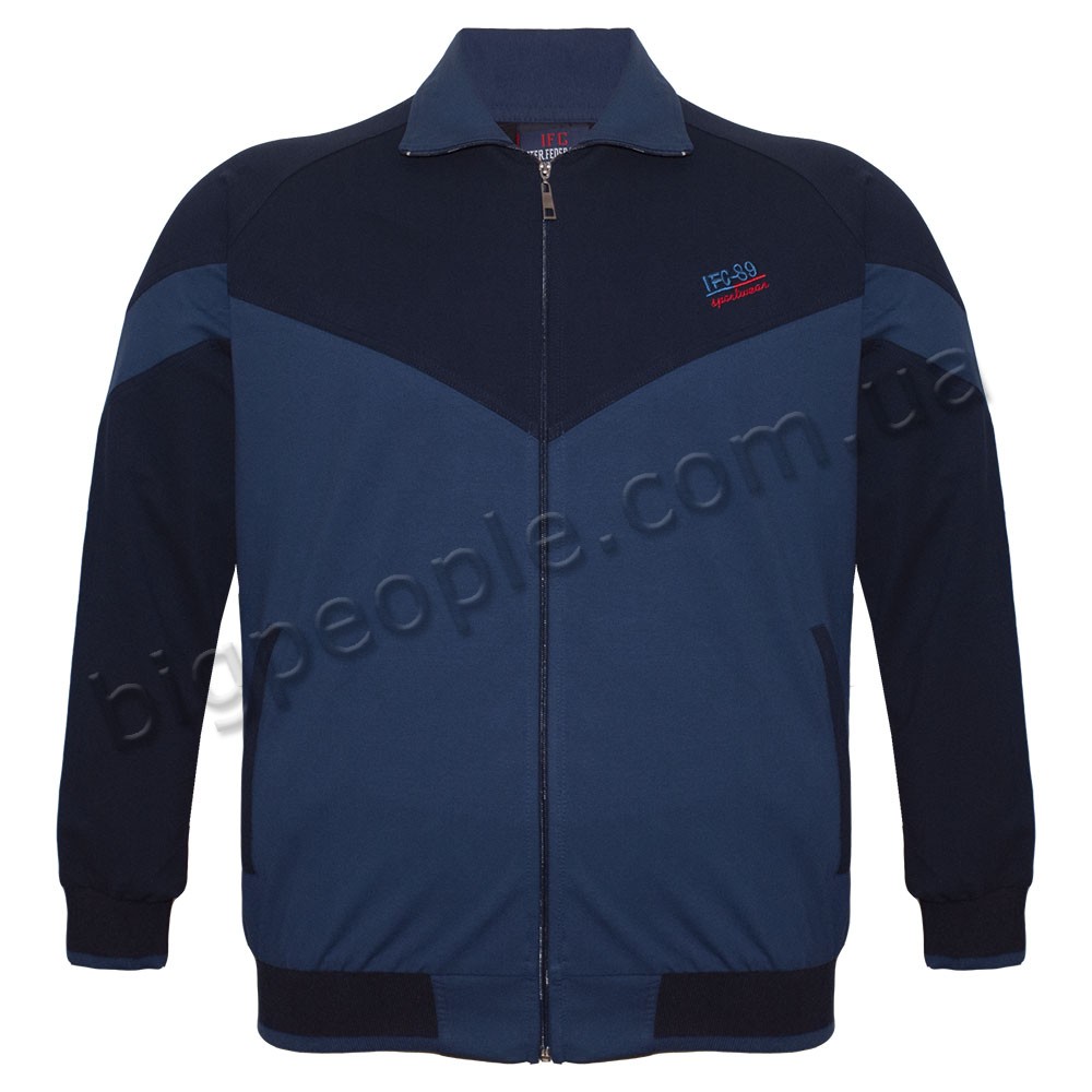 Темно-синій костюм великих розмірів для занять спортом. Зроблено в Туреччині, виробник IFC. На кельні є дві кишені на блискавці. Дві кишені на блискавці на штанях. На лівому передпліччі і лівій штанині присутня вишивка. Склад: 5 % еластан, 73 % бавовна, 22 % поліестер.