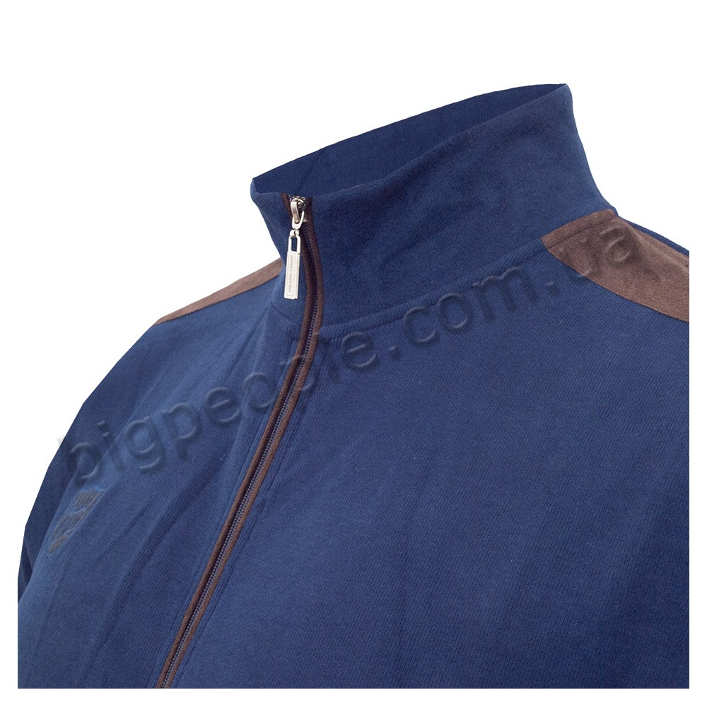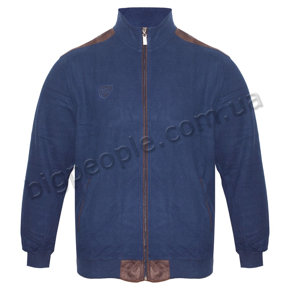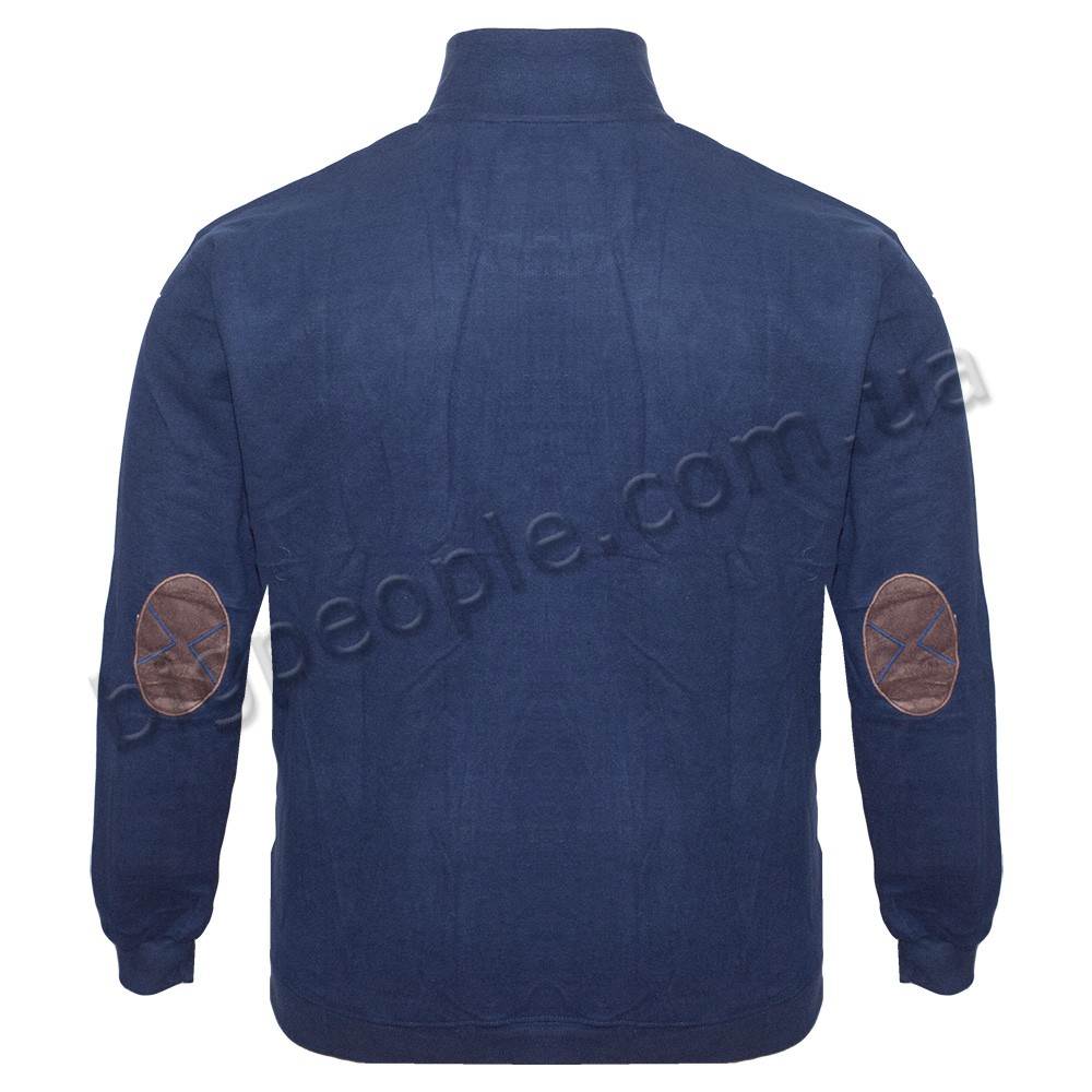 Чоловіча синя утеплена кофта для великих чоловіків GRAND CHIEF, що застібається на блискавку. Модель з тканини середньої щільності. На виробі з боків дві кишені. На плечах декоративні вставки. На правій груді логотип бренду. Виробництво Туреччина. Склад: селанік - м'яка тканина, cotton (бавовна) 30%, поліестер 30%. Внизу моделі і на рукавах манжети. Колір синій.