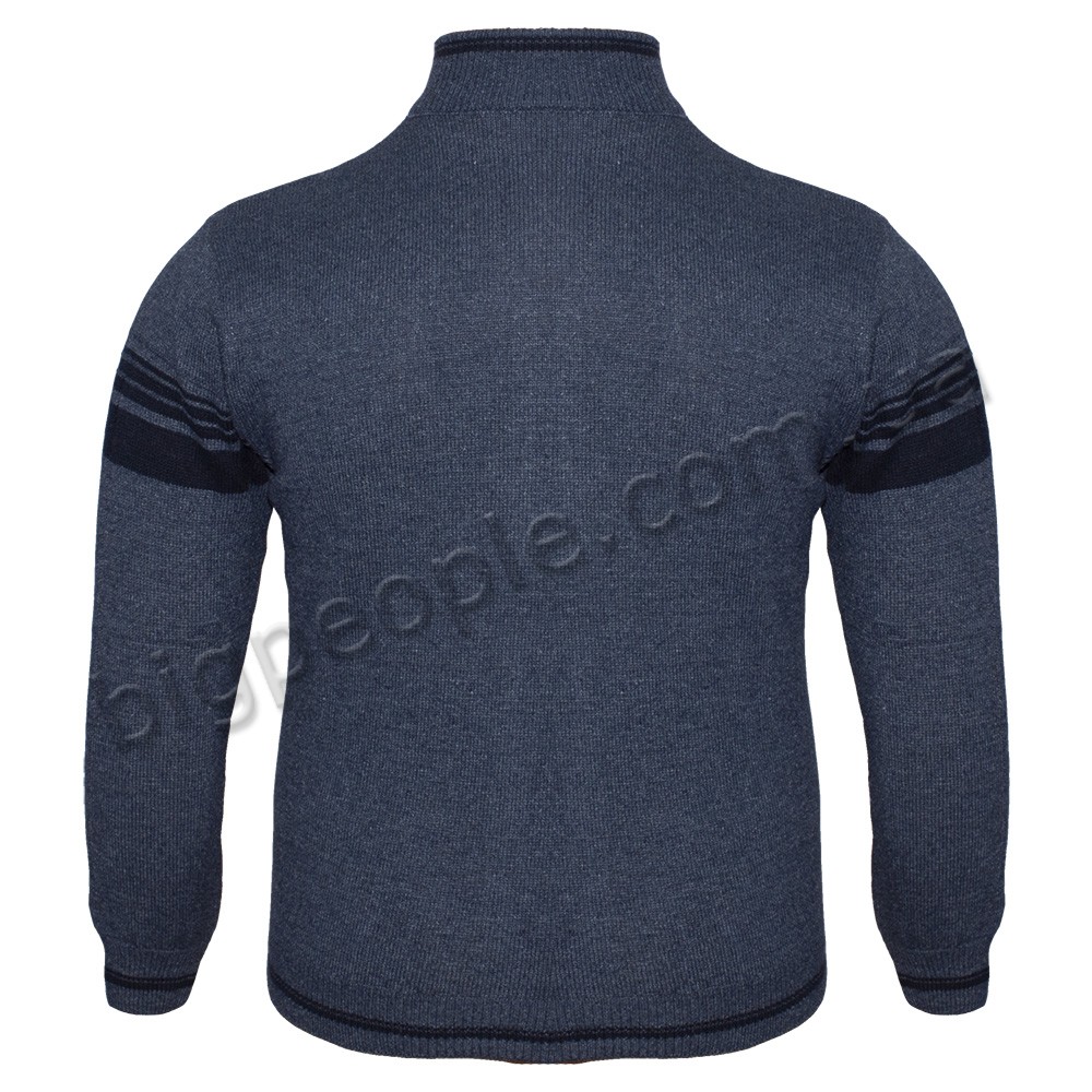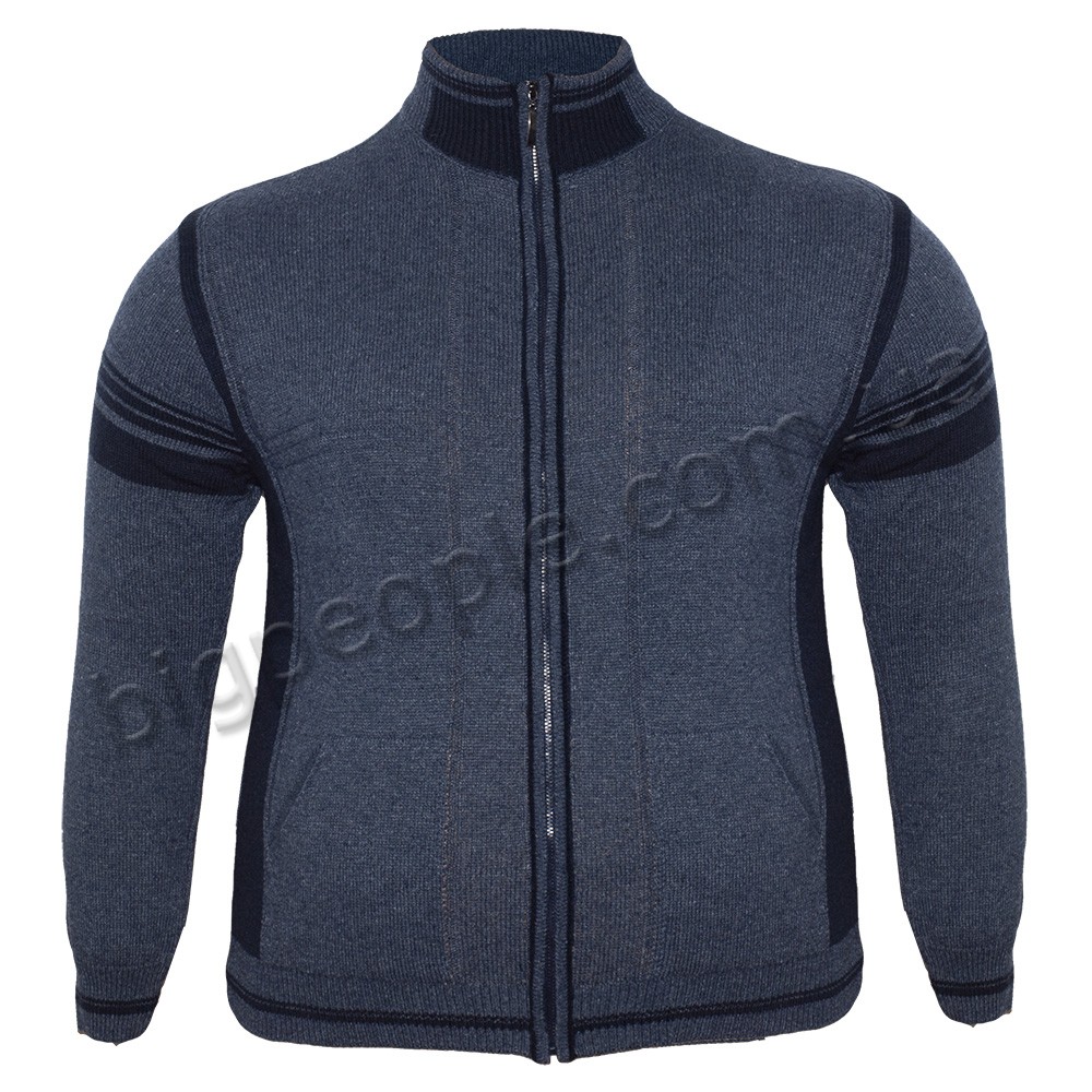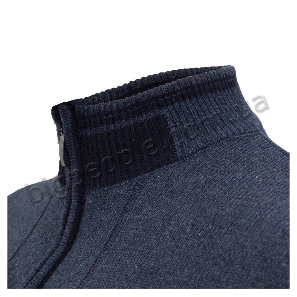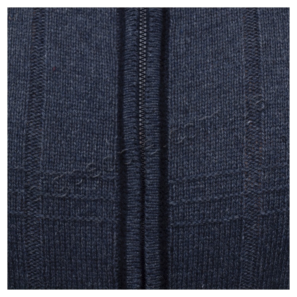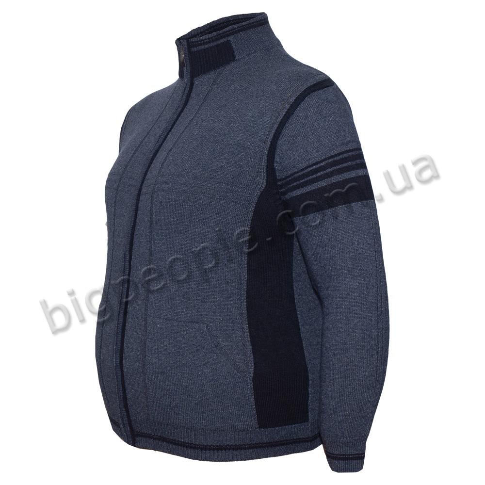 Синя чоловіча в'язана кофта великих розмірів на блискавці. Виробник TURHAN, виріб середньої щільності, комір під горло. Вироблено в Туреччині. Колір синій з темними вставками. Дві кишені з боків. Склад шерсть 70%, акрил 30%.
