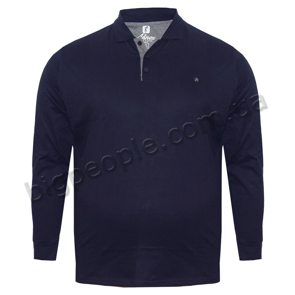 Тонка стильна чоловіча толстовка великого розміру ANNEX темно-синього кольору. Комір поло з трьома гудзиками. Низ прямий, гумки внизу немає. Рукави на манжетах. Кишені відсутні. Виробництво Туреччини. Склад cotton (бавовна) 95%, еластан 5%.