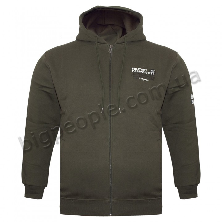 Чоловіча, колір хакі, толстовка великого розміру POLO PEPE (тепла). Застібається на блискавку. Манжет внизу і на рукавах. На грудях присутній принт. Є капюшон. Капюшон не відстібається. Склад cotton 100%. Трикотажна утеплена толстовка, тканина з начісом з виворітного боку.