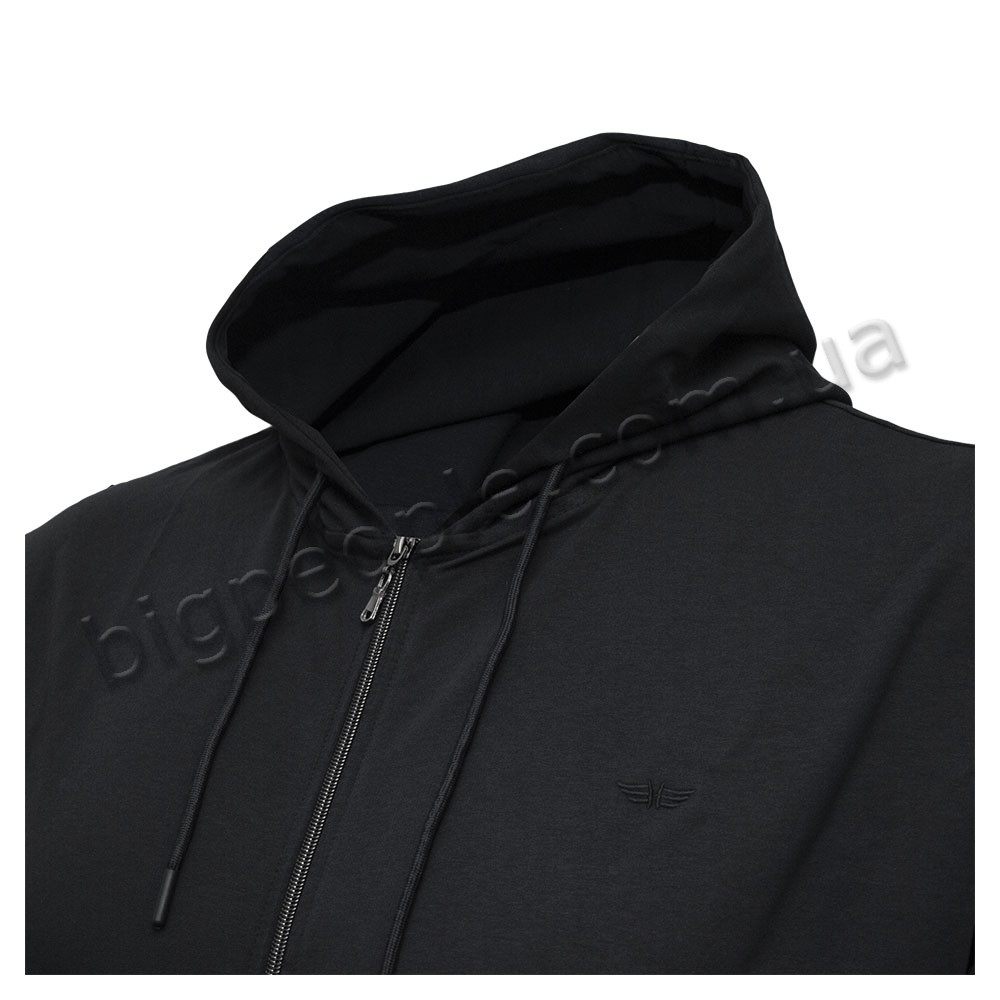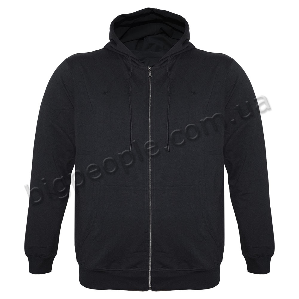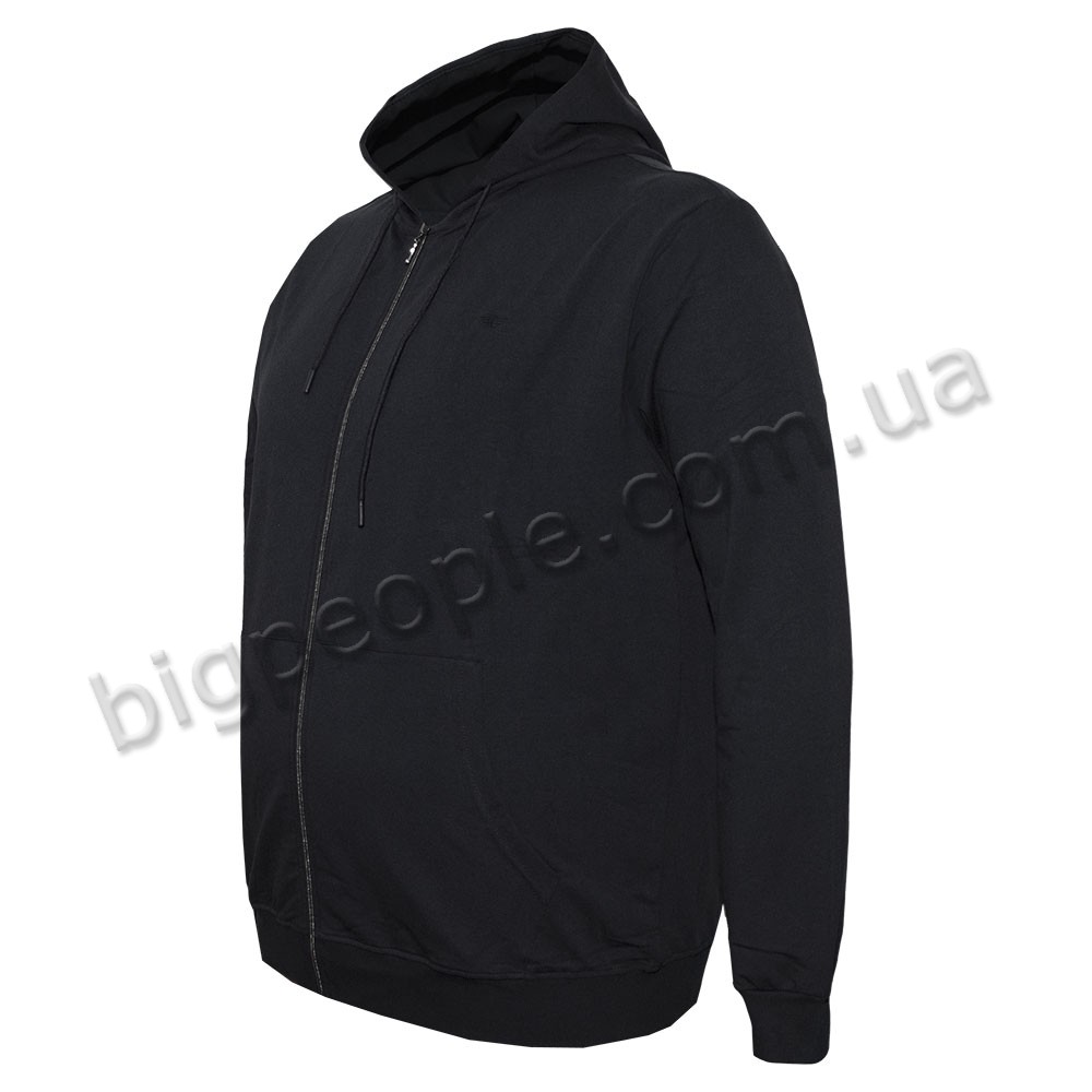 Чоловіча толстовка великого розміру TURHAN . Застібається на блискавку. Внизу та на рукавах є гумка (манжет). Є капюшон. Склад cotton 75%, поліестер 17%, еластан 8%. Трикотажна тонка кофта, тканина по щільності – дві нитки. Колір чорний.