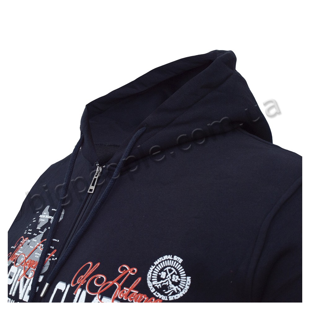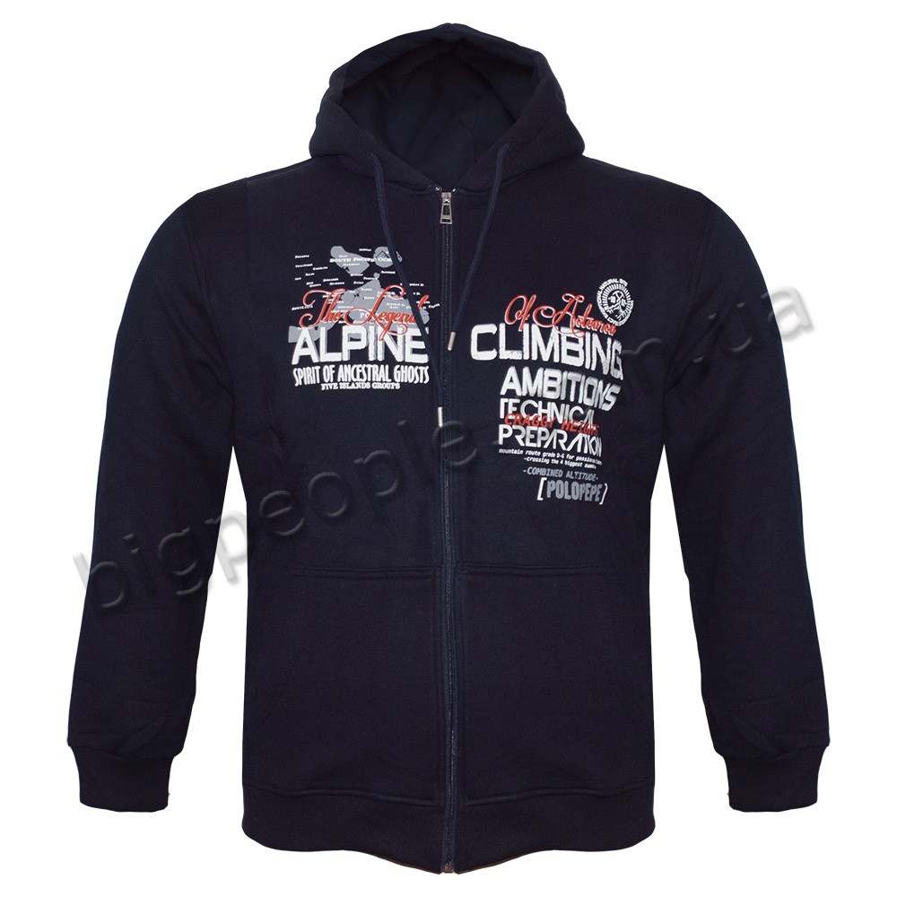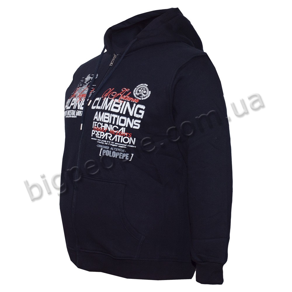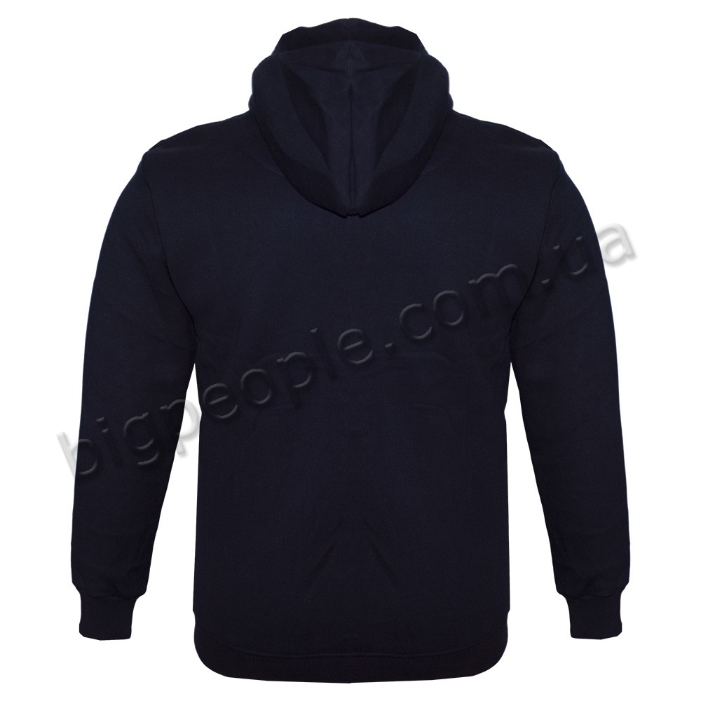 Чоловічий темно-синій батник великого розміру POLO PEPE (утеплений). Крій кишень-кенгурушка. Застібається на блискавку. Манжета внизу і на рукавах. Однотонна модель, з невеликою вишивкою на грудях. Присутній капюшон. Капюшон не відстібається. Склад cotton 100%. Трикотажний утеплений батник з начьосом на внутрішній стороні, тканина три нитки. Колір темно-синій.